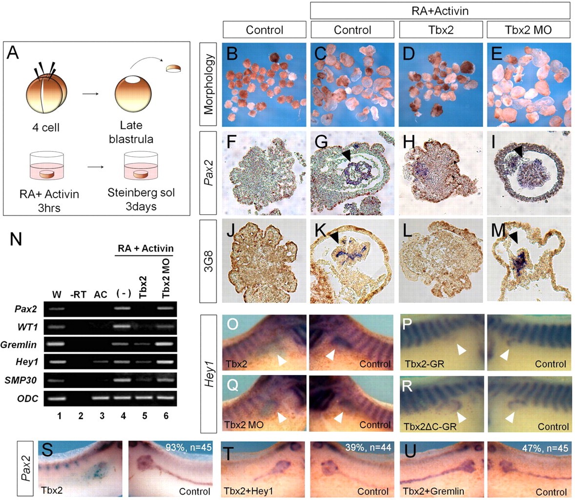 Fig. 5. Tbx2 downregulates the expression of Gremlin and Hey1 to control pronephric morphogenesis. (A) Diagram of the in vitro kidney induction assay. RA, retinoic acid. (B-N) Four-cell stage Xenopus embryos were injected in the animal pole region with Tbx2 mRNA (100 pg) or Tbx2 MO (10 ng) and then the animal explants were dissected at stage 9.5 and processed for in vitro kidney induction. Subsequently, the animal cap tissues were observed for morphology (B-E), sectioned for in situ hybridization with a Pax2 antisense probe (F-I) and immunohistochemistry with the tubule-specific antibody 3G8 (J-M) or subjected to RT-PCR analysis (N). W, whole embryo; AC, uninjected animal caps without RA and activin treatment; (â), uninjected animal caps with RA and activin treatment; âRT, negative control without reverse transcriptase; ODC, ornithine decarboxylase loading control. Arrowheads (G,K,I,M) indicate Pax2 expression or 3G8 staining in the induced animal caps. (O-R) Embryos injected with Tbx2 (200 pg), Tbx2-GR (200 pg), Tbx2 MO (10 ng) or Tbx2δC-GR (200 pg) were subject to in situ hybridization with a Hey1 antisense probe. Arrowheads indicate Hey1 expression in the pronephros. Embryos in P,R were treated with DEX from stage 22 to 32. (S-U) Impaired expression of Pax2 caused by Tbx2 was restored by co-injection of Gremlin or Hey1. Embryos injected with Tbx2 mRNA (200 pg) with or without Hey1 (100 pg) or Gremlin (10 pg) were subject to in situ hybridization for Pax2 at stage 35. n, total number of embryos analyzed; the percentage of embryos showing the phenotype illustrated is indicated. Left and right parts of each panel show the injected and uninjected control sides of embryos, respectively.