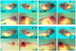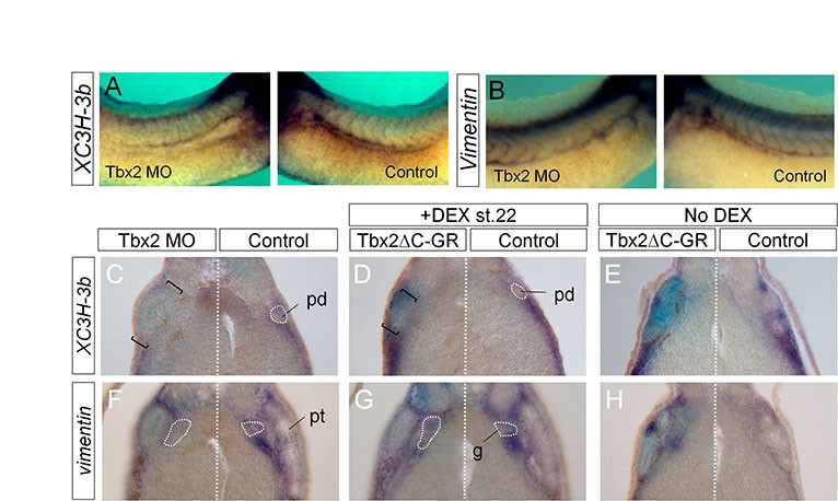 Fig. S2. Effects of the loss of Tbx2 function on expression of XC3H-3b and Vimentin. (A-H) Embryos injected with Tbx2 MO (10 ng) or Tbx2δC-GR (200 pg) were subjected to in situ hybridization for the markers XC3H-3b or Vimentin (shown for Tbx2 MO versus control in A,B) at stage 35 and then Vibratome sectioned (C-H). For the inducible Tbx2δC-GR construct, embryos were treated with dexamethasone from stage 22 to 35 (D,G) or left untreated (E,H). Left and right parts of each panel show the injected and uninjected sides of embryos, respectively. Brackets in C and D indicate the width of the pronephric duct. Dotted lines in F and G outline to the glomus domain. The expression of XC3H-3b and Vimentin was specifically detected around the pronephric nephron on the control side of embryos and these expression patterns were maintained around the pronephric nephron expanded by the depletion of Tbx2.