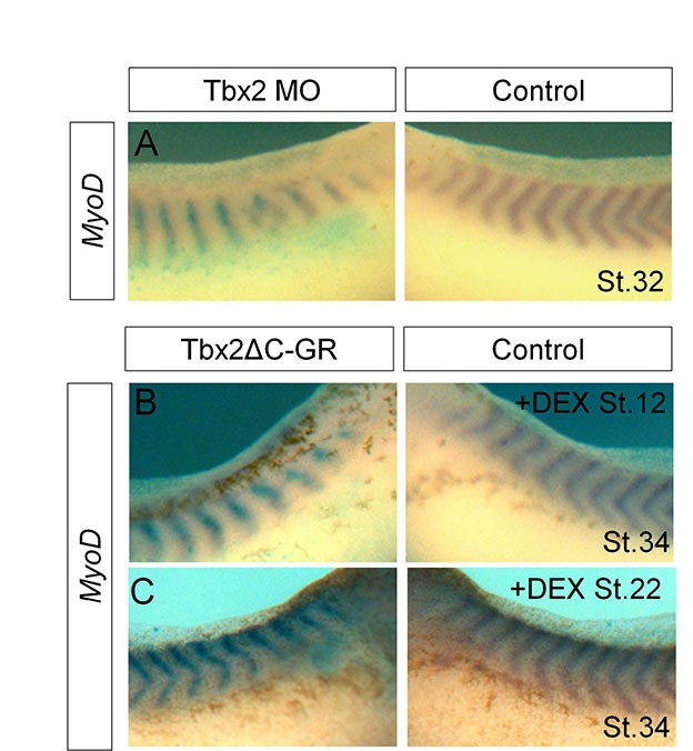 Fig. S3. Effects of inhibition of Tbx2 function on the expression of MyoD. (A-C) Tbx2 MO and Tbx2δC-GR marginally affect MyoD expression in the anterior somite regions. Embryos injected with Tbx2 MO (10 ng) or Tbx2δC-GR (200 pg) were subject to in situ hybridization with MyoD antisense probe. Embryos in B and C were treated with dexamethasone from stage 12 and 22 to 34, respectively.