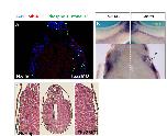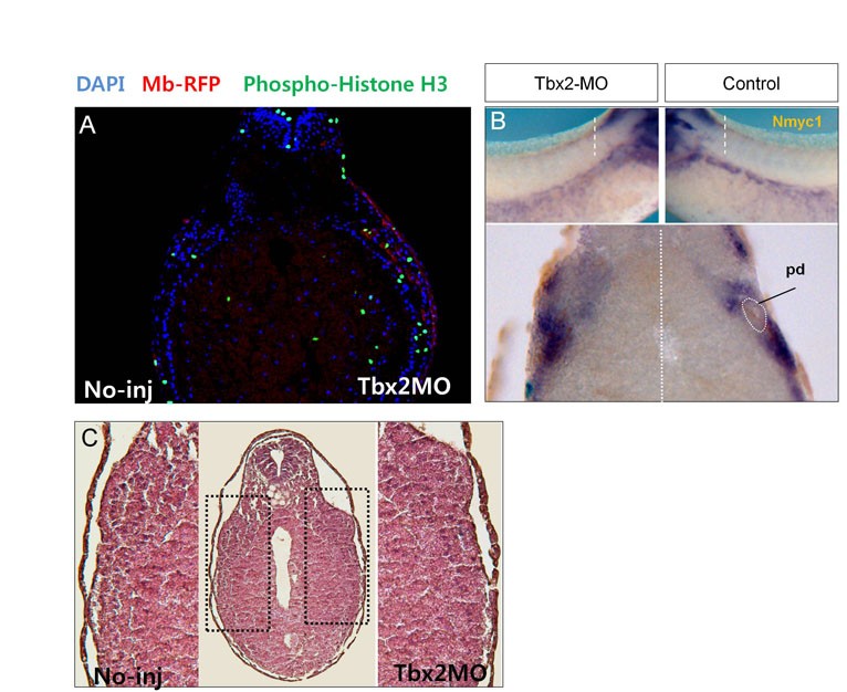 Fig. S5. Depletion of Tbx2 increases the rate of cell proliferation in the pronephric nephron. (A) Phospho-histone H3 staining of the pronephric field in a Tbx2-depleted embryo. Membrane-targeted RFP was co-injected as a lineage tracer. (B) In situ hybridization showing the expression of NMyc1 in the Tbx2 MO (10 ng)-injected and uninjected control sides of an embryo. A transverse section of the embryo shown in the upper panel at the level of the dashed line is shown beneath. The dotted line encloses the pronephric duct (pd). (C) Hematoxylin and Eosin staining of the pronephric field in the Tbx2-depleted embryo.