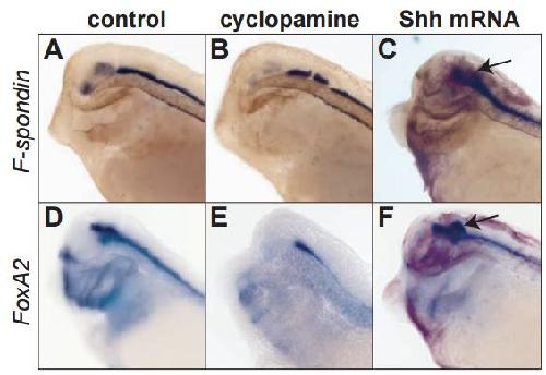 Fig. S4. Perturbation of S/Hh signaling only affects the floor plate of the brain. Lateral views of tailbud stage control (A, D), cylopamine-treated (B, E), and Shh mRNA injected (C, F) embryos, processed by ISH for F-spondin (AâC) and FoxA2 (DâF) and stained for notochord (Tor70, brown, AâC). Loss of Hh signaling results in reduced (E) or broken (B) staining of floor plate markers in the brain in 48% of cyclopamine-treated embryos (N = 149). Shh mRNA does not cause dorsal expansion of floor plate except in the brain (arrows, C and F). Pink in C, F is staining for co-injected lineage tracer. |