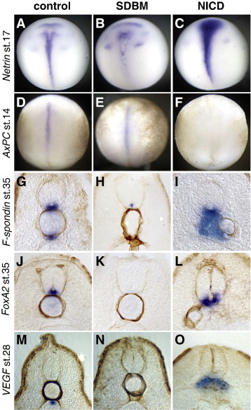 Fig. 1. Notch signaling promotes formation of floor plate and hypochord and represses notochord. Notch signaling was repressed by injection of mRNA encoding Su(H) DNA-binding mutant (SDBM, B, E, H, K, N) and activated by Notch intracellular domain mRNA (NICD, C, F, I, L, O). Floor plate development was assayed by expression of Netrin (AâC), F-spondin (GâI), and FoxA2 (JâL). Notochord formation was assayed by Axial protocadherin (AxPC, DâF) and Tor70 staining (brown, GâO). Tor70 staining has high variability and background, and thus should not be considered quantitative. Hypochord development was assayed by F-spondin (GâI, staining ventral to notochord) and VEGF (MâO). (AâF) Dorsal views, anterior up. (GâO) Transverse vibratome sections through middle of spinal cord at tailbud stages. |