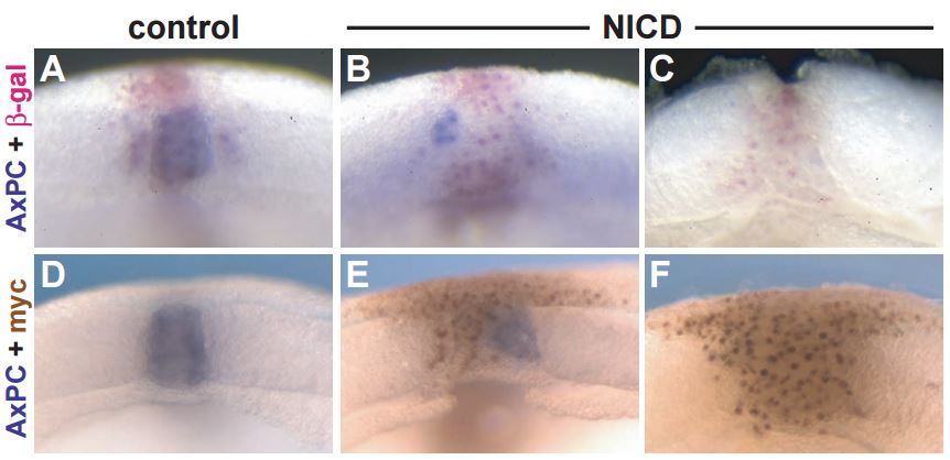 Fig. S1. Notch-expressing cells do not contribute to notochord. NICD-myc mRNA was injected with (B, C) or without (E, F) β-galactosidase mRNA as a lineage tracer into both dorsal blastomeres to target the midline. Embryos were fixed, bisected transversely, stained for lacZ (pink, AâC), and processed by ISH for AxPC expression in the notochord (purple, AâF). This injection technique efficiently targets the midline (A), with labeled cells in FP, notochord, dorsal endoderm and sometimes medial somite. Embryos with activated Notch have reduced (B, E) or absent (C, F) notochord. Co-injected lineage tracer never labels any notochord that forms (B). Staining for NICD protein (αnti-myc, brown in E, F) shows that NICD+ cells never give rise to the notochord. |