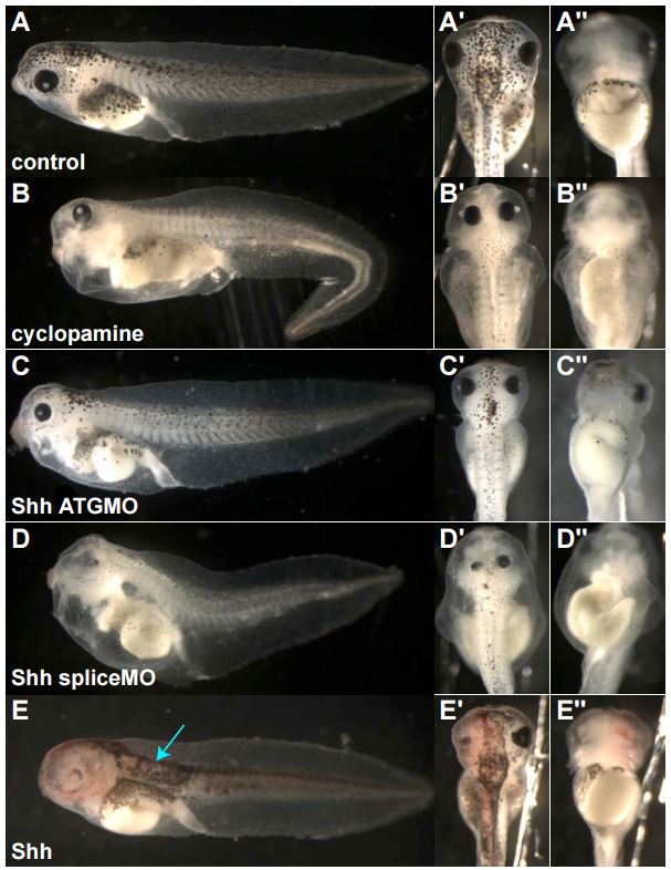 Fig. S3. Loss of Shh signaling and Hh signaling cause similar developmental defects. (A) Control embryos at stage 42, lateral (A), dorsal, (A') and ventral (A") views. (B) Cylopamine treatment blocks all Hh signaling, resulting in reduced melanocytes, edema, and kinked tail (B), closely spaced eyes (Bâ), and gut-looping defects (B"). Injection of MOs designed to the translation start site (âShh ATGMO,â CâC") and splice donor site (âShh spliceMO,â DâD") show similar phenotypes. (E) Injection of Shh mRNA (pink, lacZ staining) results in excess melanocytes (D, arrow), ventralization of the eye (E, E'), and gut looping defects (E"). |
