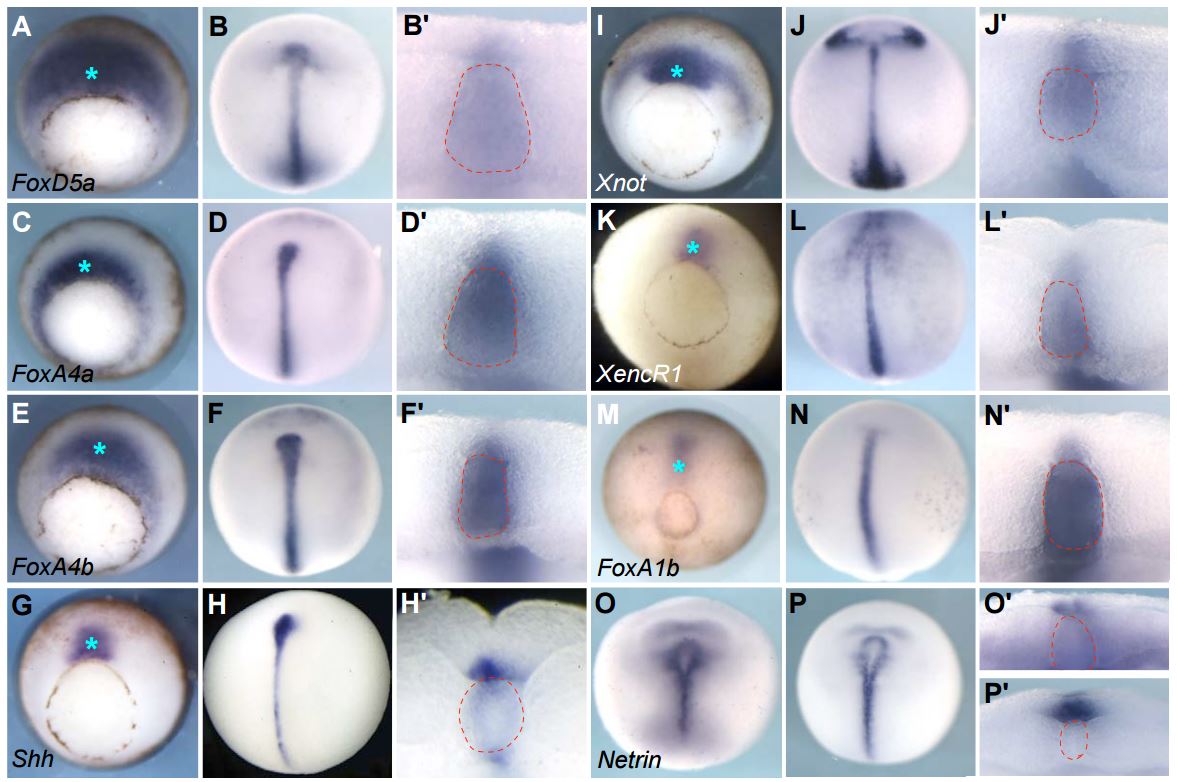 Fig. S6. Analysis of floor plate markers reveals two separate populations of medial floor plate. In situ hybridization for indicated markers was performed at stage 10.5â11 (A, C, E, G, I, K, M) and neurula stages (st.14âB, D, F, J, L, N, O; st.16âH, P). Prime panels (B', etc.) show transverse bisections of matching neurula stages (notochord outlined in red). Markers expressed in the organizer (marked by asterisk) at gastrula stages are expressed throughout the dorsal midline and in a narrow domain in the floor plate (AâN') at neurula stages. Netrin expression begins at early neurula stages (st.14, O) in a wider domain than early markers (O', P' compared to B'âN'). We have designated the narrow, early-forming FP the 1° MFP and the wider, later-forming FP the 2° FP. |