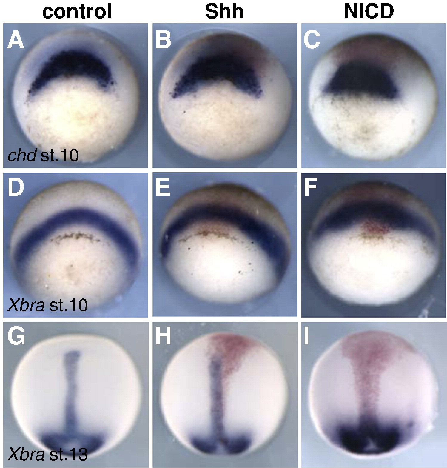 Fig.4. Ectopic Shh does not affect notochord formation and Notch signaling acts after specification to repress the notochord fate. Shh mRNA overexpression does not repress notochord specification at stage 10, assayed by chd (B) and Xbra (E), or notochord formation during gastrulation (Xbra, H). Activated Notch signaling does not affect notochord specification (C, F), but potently represses subsequent notochord formation (I). Pink is lacZ staining of co-injected lineage tracer. |