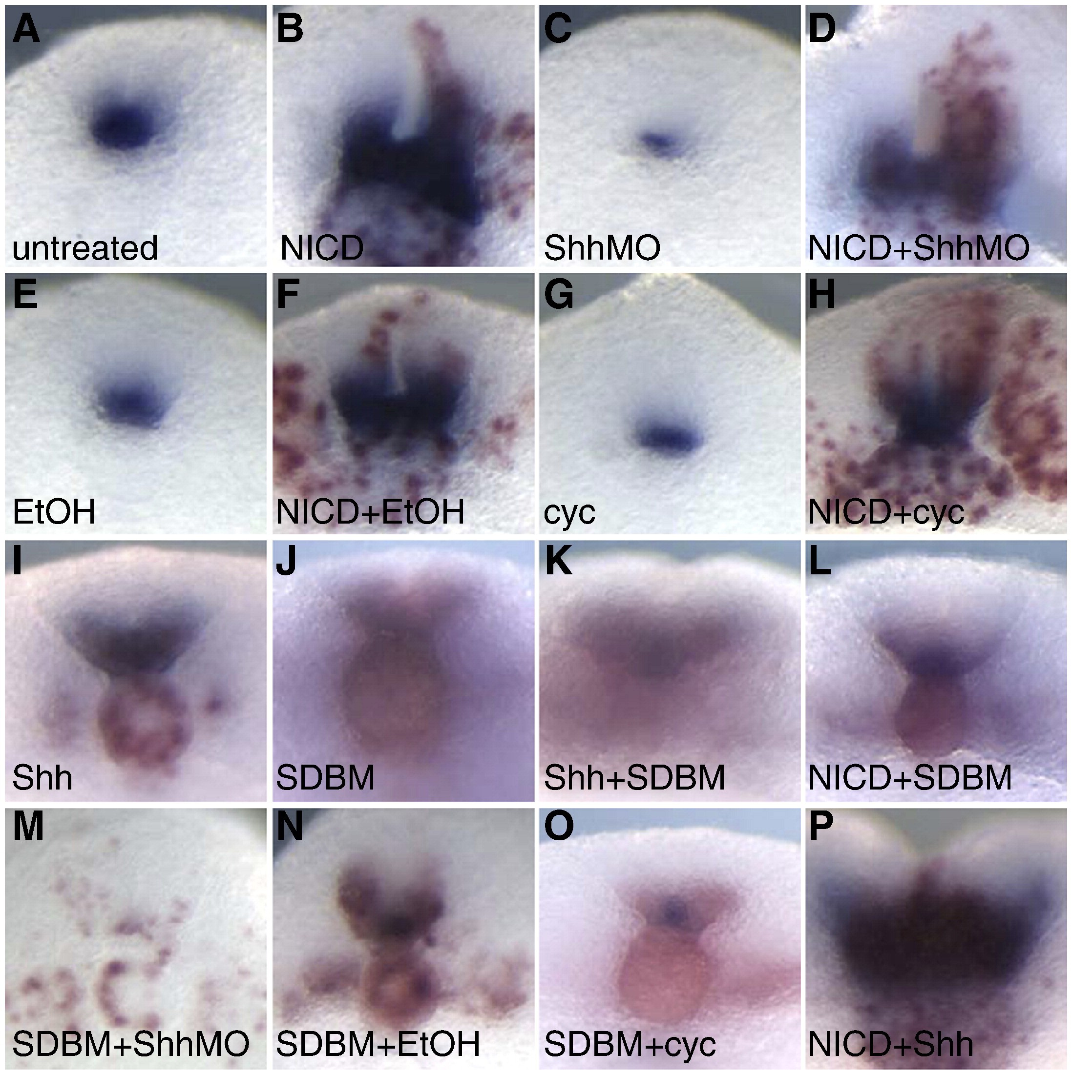 Fig.6. Shh and Notch signaling act in parallel to specify floor plate. Epistasis (AâL) and enhancement (MâP) experiments to determine the contribution of Notch and Shh signaling to floor plate formation. Embryos were injected and/or treated with reagents listed, fixed at stage 20â22, bisected and stained for co-injected lineage tracer (pink), then processed for Netrin ISH. Activated Notch signaling upregulates Netrin (B, F), while blockade of Shh signaling slightly reduces Netrin (C, G). Activation of Notch and blockade of Shh in the same embryo results in a Notch phenotype (D, H). Shh overexpression leads to a slight increase in FP (I), and blockade of Notch signaling leads to a decrease (J). Activation of Shh and blockade of Notch in the same embryo results in a Notch phenotype (K). Blockade of Notch signaling downstream of NICD with SDBM is able to rescue FP and notochord development to normal (L). Blockade (M, O) or activation (P) of both Notch and Shh signaling in the same embryo gives more severe phenotypes than perturbing either pathway alone. |