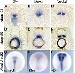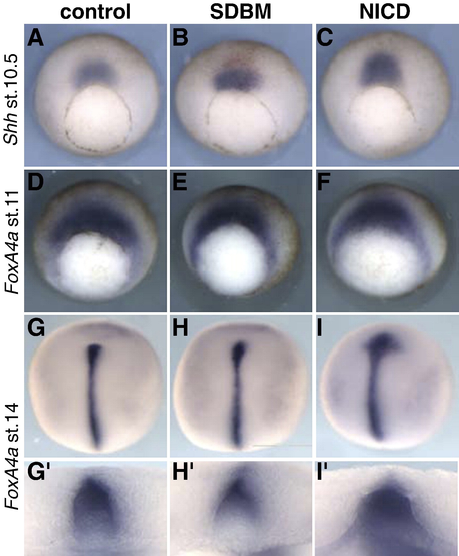 Fig.7. Notch signaling does not regulate gastrula midline markers or 1° MFP. Shh and plvs are markers of 1° MFP ( Fig. S6). Blockade (B, E, H) and activation (C, F, I) of Notch signaling does not affect gastrula stage expression of these markers (AâF). Expression of plvs upon perturbation of Notch signaling (GâI) looks much like that of Shh (see Fig. 2), with FP expression only mildly affected (G'âI'). (G'âI') Transverse bisections of GâI. |