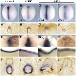 Fig. 2. Perturbation of Notch signaling has variable effects on Shh expression. Shh expression in neurula (st.16, AâH) and tadpole (st.35, IâL) embryos upon blockade (B, F, J) and activation (C, D, EâH, K, L) of Notch signaling. Shh is expressed in the floor plate and notochord (A, A', I, I'). Blockade of Notch signaling led to a slight reduction in the floor plate domain of Shh in 31% of embryos (B, B'), but many embryos showed normal expression (J', 69%). Activated Notch signaling led to increased expression throughout the midline (C, C'), though the floor plate domain was normal (F, K'), in 27% of embryos. In a significant proportion of embryos (69%, p < 0.05), activated Notch led to a decrease in Shh expression throughout the midline (H, L') or in the floor plate domain (G). In NICD tadpoles, Shh expression was decreased and/or patchy in the spinal cord (K, L). The variable response of Shh to Notch activation is not correlated with amount or distribution of NICD protein (EâH, αnti-myc staining for NICD-myc in brown). NICD in the lateral neural plate does not cause ectopic Shh expression (E), while NICD in the FP domain can result in Shh expression (F), or repression (G, H). (A'âD') Transverse sections of (AâD); faint notochord expression of Shh is not visible in thin sections. (EâH) αnti-myc staining (brown) was performed on transversely bisected embryos after ISH for Shh (purple). The notochord is outlined in red and the ventral boundary of the neural plate in blue. (IâL) Lateral view of tailbud stage embryos. (I'âL') Transverse vibratome sections through middle of spinal cord at tailbud stages. |