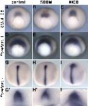 Fig.5. Lateral floor plate is regulated by Shh signaling. Nkx2.2 is a marker of the LFP in zebrafish and chick. At onset in frog (stage 22), it is expressed in two stripes in the ventral neural tube (C) lateral to Shh (A) and Netrin (B). At tadpole stages, Shh (D), Netrin (E), and Nkx2.2 (F) clearly mark distinct domains. LFP formation requires Shh signaling (H) and Shh overexpression can induce ectopic Nkx2.2 throughout the brain and upregulation in the spinal cord (I) at stage 22. (AâF) Transverse vibratome sections following ISH and Tor70 staining of the notochord (brown, DâF). (GâI) Dorsal views, anterior up. |