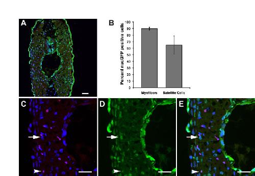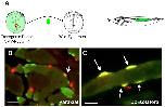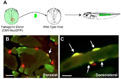 Fig. 2. Origin of satellite cells in neurula stage mesoderm. (A) Orthotopic grafting from a GFP transgenic donor into wild-type host. (B,C) Immunofluorescent images of tailmuscle of host tadpoles demonstrating Pax7-labeled satellite cells (red) colocalized with GFP. Grafts of paraxial mesoderm labeled few if any satellite cells (arrow in B), while grafts of dorsolateral mesoderm labeled significantly more satellite cells (arrows in C).