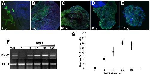 Fig. 5. Pax7-positive cells induced by BMP4 in FGF-treated animal caps. (A-E) Immunofluorescence staining of Pax7 (red) and Myosin (green) of animal caps injected with different doses of Bmp4 mRNA. Scale bars: 200 μm. (F) RT-PCR analysis of Pax7 expression in response to Bmp4 mRNA. (G) Number of Pax7-positive cells counted in animal caps after injection of Bmp4 mRNA. Five explants were sectioned per treatment for cell counts and three per treatment for RT-PCR analysis. Results are mean ± s.e.m.