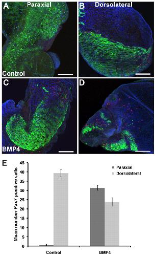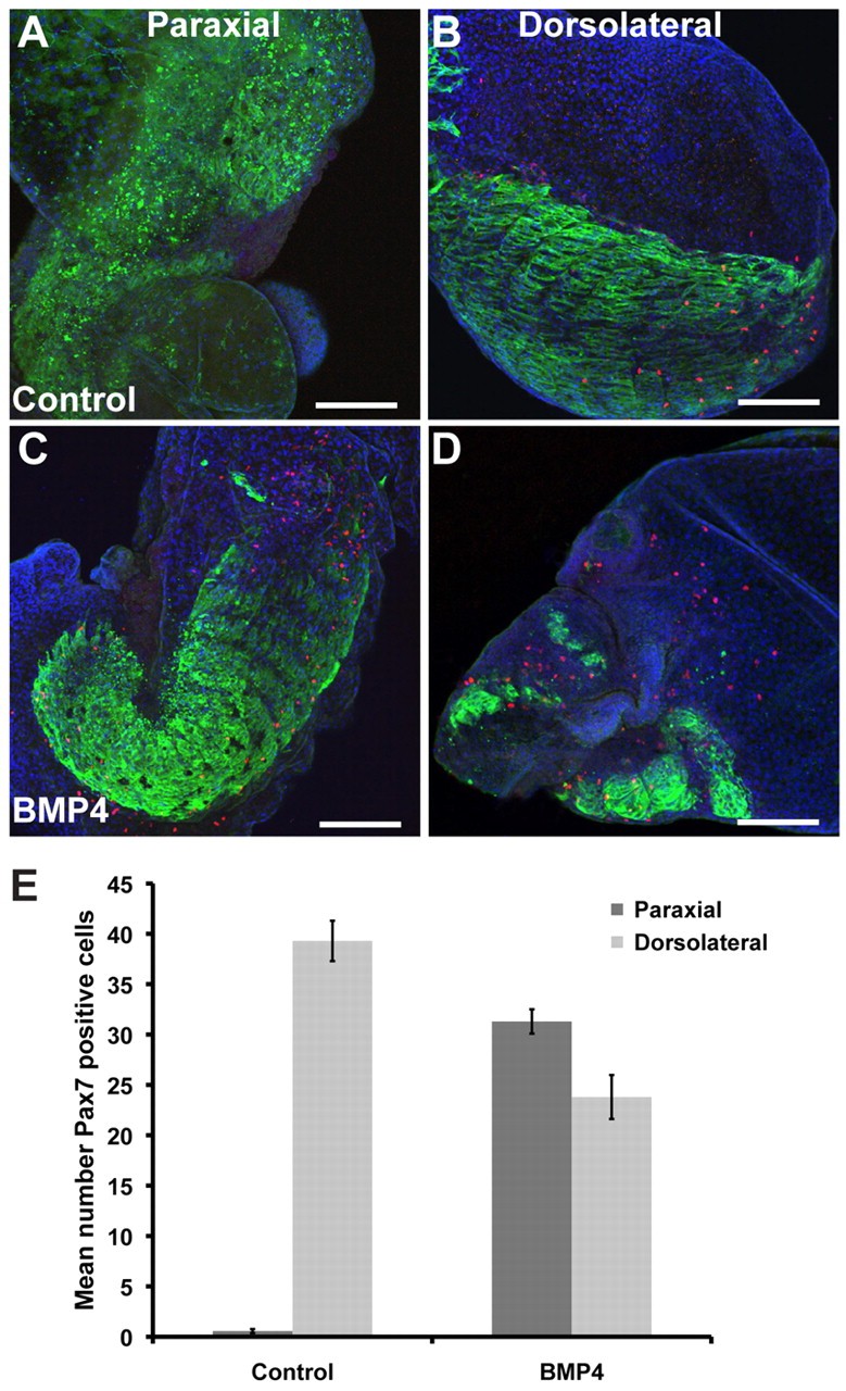 Fig. 6. Regulation of satellite cell formation in neurula stage explants by BMP4. All explants are stained for Myosin (green) and Pax7 (red). (A) Paraxial explant. (B) Dorsolateral explant. (C) Paraxial + BMP4. (D) Dorsolateral + BMP4. Scale bars: 200 μm. (E) Pax7-positive cells in each type of explant. n=5 per group. Results are mean ± s.e.m.