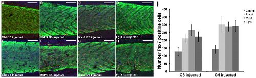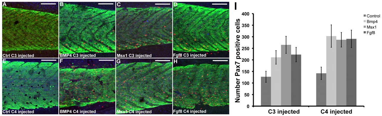 Fig. 7. Effect on satellite cell formation of overexpressing candidate genes in vivo. (A-H) Whole mounts of tailmuscle of whole tadpoles which had the indicated mRNA injected into C3 or C4 at the three-cell stage. An increase in satellite cell formation is evident for all three genes. Scale bars 200 μm. (I) Total number of satellite cells in a standard area of tailmuscle, following overexpression of the indicated gene in blastomere C3 or C4. n=5 per group. Results are mean ± s.e.m.