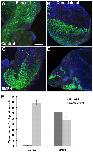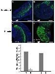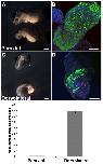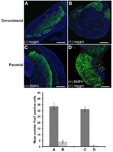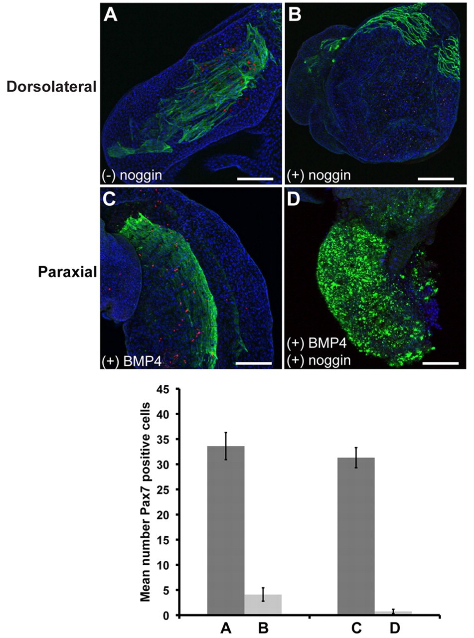 Fig. 8. Suppression of satellite cell formation in neurula stage explants by Noggin. Explants taken from HGEM-Noggin embryos at the neurula stage and allowed to develop for 4 days. (+) noggin indicates that the explants received heat shocks to induce Noggin expression; (â) noggin indicates that they did not. (A) Dorsolateral explant. Like wild-type explants, this forms numerous Pax7-positive cells. (B) Dorsolateral explant with induced Noggin forms very few Pax7-positive cells. (C,D) The induced Noggin is biologically active in the desired range. (C) An unheated paraxial explant treated with BMP4. Like similar wild-type explants, this shows induction of numerous Pax7-positive cells. D shows a paraxial explant that is treated with BMP4 and heated to induce Noggin. In this case, there is no induction of Pax7-positive cells, indicating that the induced Noggin can inhibit BMP4 in the relevant concentration range. Bar chart shows Pax7-positive cell counts for each type of explant. n=5 per group. Data are mean ± s.e.m. Scale bars: 200 μm.