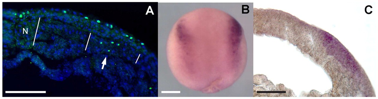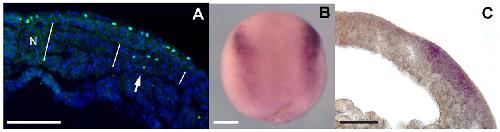 Fig. 9. Smad1-phosphate and Msx1 expression. (A) Immunostain of cryosection of stage 13 neurula showing some nuclei positive for Smad1-P in the dorsolateral mesoderm (arrow), but not the paraxial mesoderm. White lines indicate the approximate extent of the paraxial and dorsolateral explants used in other experiments. N, notochord. (B) Whole-mount in situ hybridization of stage 13 neurula for Msx1. (C) In situ hybridization for Msx1 on section: staining is apparent only in the neural crest. Scale bars: 100 μm.