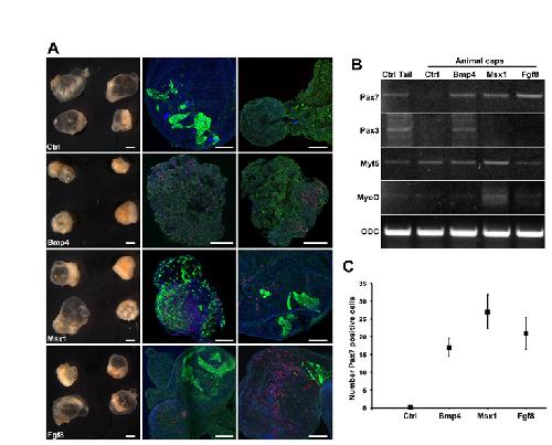 Fig. S3. Formation of satellite cells in animal caps. (A) Animal caps injected with mRNA for the indicated genes after 5 days in culture. Control animal caps generate muscle fibers (Myosin, green) but do not show formation of Pax7-positive cells (red). However, animal caps expressing Bmp4, Msx1 or Fgf8 produce numerous Pax7-positive cells. (B) RT-PCR analysis of day 5 animal caps. Animal caps expressing Bmp4, Msx1 or Fgf8 show an increase in Pax7 expression compared with control. (C) Summary chart showing the mean number of satellite cells formed in animal caps after Bmp4, Msx1 or Fgf8 expression. Scale bars: 200 . Eight animal caps per treatment were sectioned for the cell counting and three per treatment for the RT-PCR analysis.