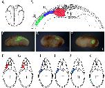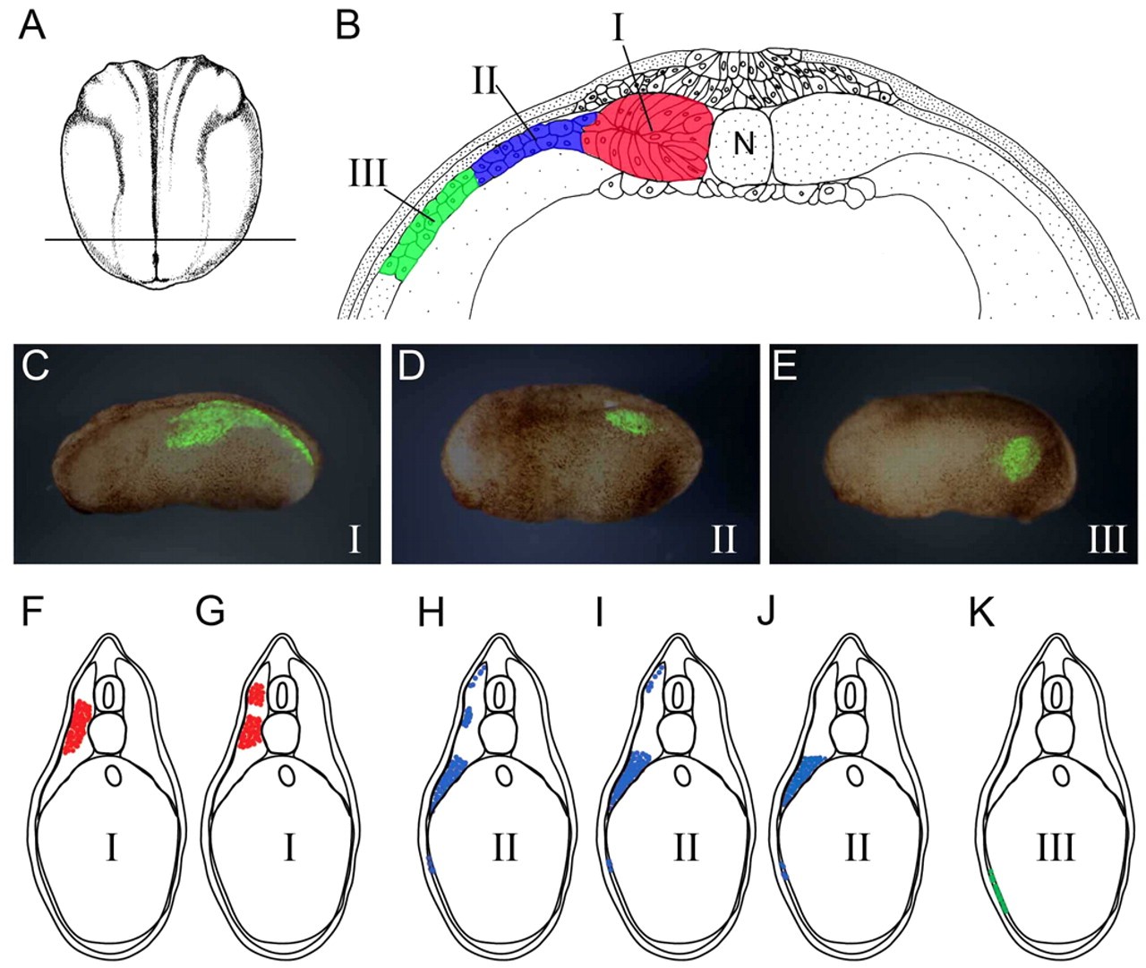 Fig. 1. Fate mapping by orthotopic graft. (A,B). Location of paraxial, dorsolateral and ventrolateral regions of mesoderm used for orthotopic grafts. (A) Dorsal view of a stage 13 embryo. Anterior is upwards. The line indicates the position of the cross-section shown in B. (B) The mesoderm regions indicated by I, II and III stand for the paraxial, dorsolateral and ventrolateral mesoderm, respectively. N, notochord. (C-E) Typical labeling patterns for the three types of graft, viewed by GFP fluorescence. (F-K) Labeling patterns of typical individual embryos projected onto standard transverse sections of stage 32 embryos. The red in F and G shows two typical labeling distributions of paraxial mesoderm grafts. The blue in H-J shows three typical labeling pattern of dorsolateral mesoderm grafts. (K) Labeling of ventrolateral mesoderm always goes to the body wall or the gut wall, indicated in green.