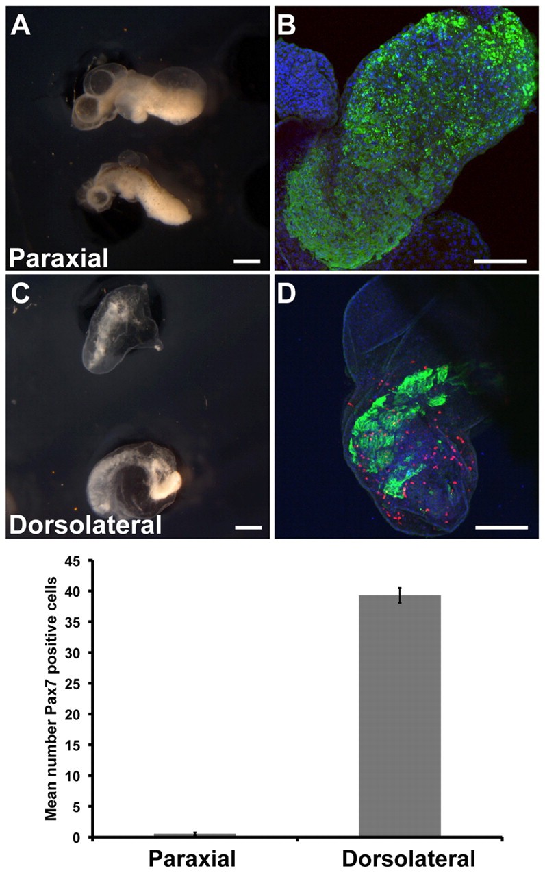 Fig. 3. Specification of Pax7-positive cells in neurula explants. (A) Paraxial explants. (B) Confocal view of paraxial explant immunostained for Myosin (green) and Pax7 (red). There are many myofibers but almost no Pax7-positive cells. (C) Dorsolateral explants. (D) Confocal view of dorsolateral explant immunostained for Myosin (green) and Pax7 (red). There are many Pax7-positive cells. DAPI staining (blue) was used to identify total nuclei. Scale bars: 200 μm. Bar chart shows the mean number of Pax7-positive cells counted per explant. Data are mean ± s.e.m. n=12 for each explant type.