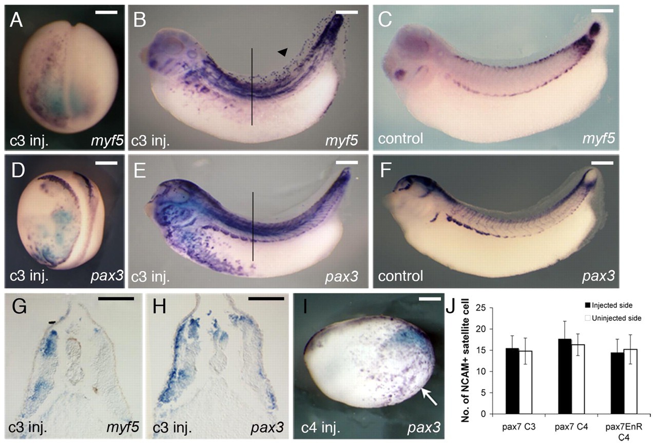 Fig. 4. Pax7 mRNA injection induces ectopic expression of Myf5 and Pax3. Xenopus Pax7 mRNA (1 ng) was injected into blastomere C3 of the left side at 32-cell stage. (A,B,G) Expression of Myf5. (C) Control embryo showing normal Myf5 at stage 34. (D,E,H) Expression of Pax3. (F) Control embryo showing normal Pax3 at stage 34. (I) Expression of Pax3 mRNA in embryo injected with Pax7 mRNA in C4 blastomere at 32-cell stage. Arrow indicates ectopic Pax3 expression. (J) Effect on satellite cell numbers of overexpression of Pax7 or Pax7EnR. There is no significant difference between the number of satellite cells on the injected and uninjected side. Each count represents five sections from 10 embryos. Results are mean ± s.e.m. The black lines in B and F indicate the position of sections in D and H, respectively. The black arrowhead in B shows the expression of Myf5 in fins. Scale bars: 100 μm.