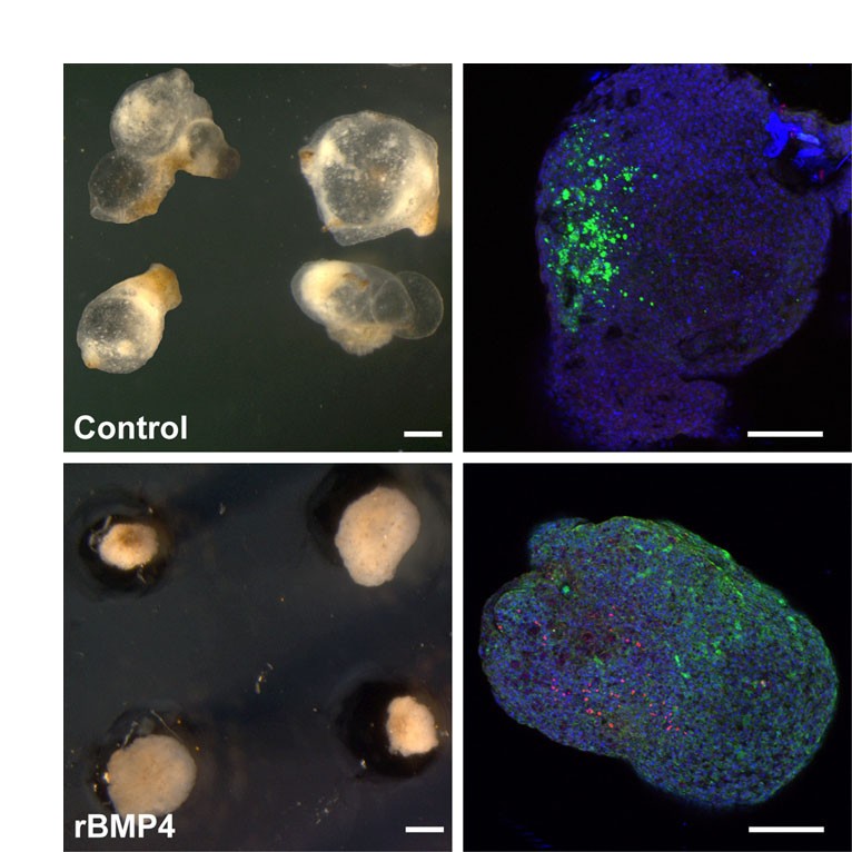 Fig. S4. Animal caps treated with FGF and BMP4. This shows a similar result to Fig.S3, but uses treatment with BMP4 protein instead of injection of Bmp4 mRNA. Scale bars: 200 .
