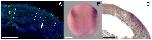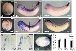 Fig. S2. Lineage tracing of mesoderm by RDA injection at 32-cell stage. RDA was injected into blastomere C3 or C4 at the 32-cell stage. (A,C,E,F) C3 injection. (B,D,G) C4 injection. (A,B) Dorsal view of stage 16 embryos receiving RDA. Anterior is towards the top. (C,D) Sections of stage 16 embryos with RDA injection. (E-G) Sections of stage 32 embryos with RDA injection. (E) An anterior section of a C3 injected embryo and (F) is its more posterior section. (G) The presence of RDA both in the ventral somite and the dorsomedial lip of the somite. The sections were counterstained with DAPI. Scale bars: 100 .