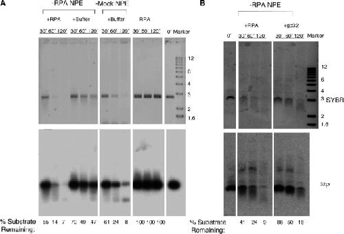 Figure 2. Effect of RPA on DNA end processing. (A) 4 ng/µl of linear pUC19 DNA labeled by [32P]dATP and blocked by ddTTP at the 3′ end was incubated in RPA-depleted NPE (supplemented with either 0.25 µM RPA or buffer) or mock-depleted NPE. One additional reaction, pUC19 incubated with the RPA protein only, served as a control. Samples were taken at the indicated times, treated with SDS-EDTA–proteinase K, and separated on a 1% TAE-agarose gel. The gel was first stained with SYBR gold to detect total DNA and then dried for exposure to phosphoimager to detect 32P. The percentages of the substrate remaining were relative to the zero time point. (B) Differential activities of RPA and gp32 in supporting DNA end processing in RPA-depleted NPE. The final concentrations for RPA and gp32 were 0.25 and 1 µM, respectively. Molecular markers are given in kilobases.