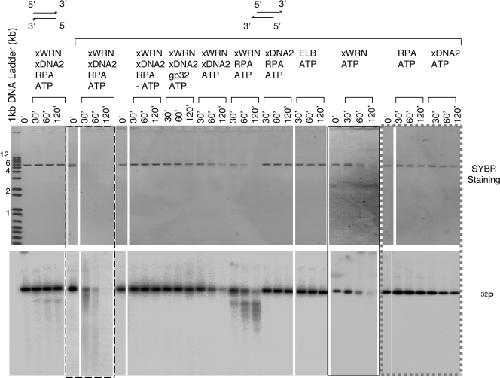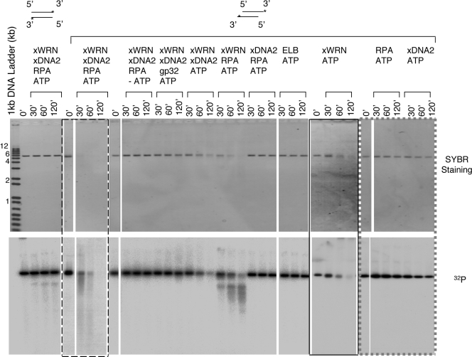 Figure 6. xWNR, xDNA2, and RPA are sufficient to degrade 5′ preprocessed DNA. Purified xWRN, xDNA2, and RPA or gp32 were incubated with blunt-ended DNA or 5′ preprocessed DNA (labeled on the 3′ end) in various combinations in the presence or absence of ATP. Asterisks indicate the 32P label. Samples were taken at the indicated times, treated with SDS-EDTA–proteinase K, and separated on four 1% TAE-agarose gels. The gels were first stained with SYBR gold and then dried for 32P. Reactions from the same gel are indicated by a bounding box, a dashed bounding box, a gray dashed box, or no bounding box. White lines indicate that intervening lanes have been spliced out. Molecular markers shown on the left are given in kilobases.