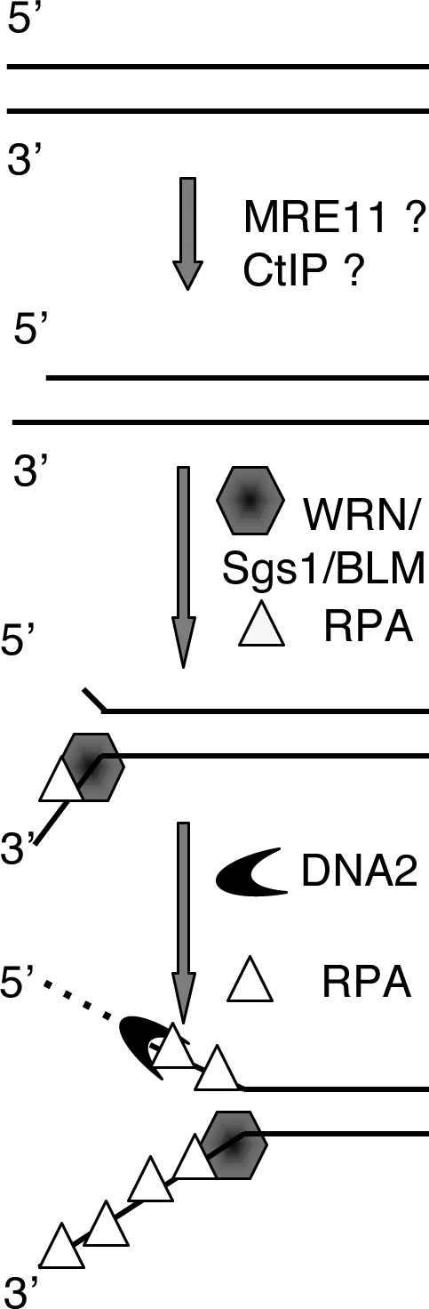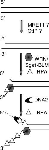 Figure 7. The WRN-DNA2-RPA–mediated DNA end processing pathway. After initial processing by a yet to be defined (probably a MRE11 and CtIP dependent) mechanism, WRN (and other RecQ-type helicases, such as Sgs1 and BLM) unwinds DNA ends. The 5′ ss-tail is then degraded by an ss-DNA exonuclease, such as DNA2. RPA stimulates both reactions.