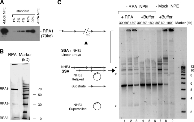 Figure 1. Effect of RPA depletion on SSA. (A) Western blot of RPA- or mock-depleted NPE. RPA was detected with a rat antibody against the large subunit (p70). The standards for quantitation were extracts loaded at the indicated amounts relative to the depleted extracts. (B) Silver staining of the RPA protein purified from Xenopus egg extracts. 0.5 µg of protein was separated by a 12% SDS-PAGE and then detected by silver staining (Bio-Rad Laboratories). The right lane is the protein size marker (Invitrogen). (C) SSA repair in RPA- and mock-depleted NPE. 12 ng/µl of the pRW4* substrate was incubated in RPA- and mock-depleted NPE at room temperature, and the samples taken at the indicated times were treated with SDS-EDTA–proteinase K, separated on a 1% TAE-agarose gel, and detected by SYBR gold staining. The NHEJ products are marked by the asterisks, and the SSA products are marked by the arrow and the bracket. (n) represents multiple repeats.