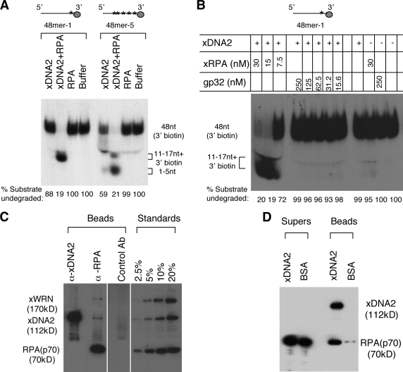 Figure 4. Functional and physical interactions between RPA and xDNA2. (A) The effect of RPA on xDNA2’s 5′→3′ exonuclease activity against two different single-stranded oligonucleotides. The substrates were labeled with 32P-labeled dA (marked by the asterisks) and attached to Streptavidin paramagnetic beads via the 3′ biotin-dC. After incubation at room temperature for 1 h, the reactions were stopped with SDS-EDTA, boiled for 10 min, and separated on a 10% TAE-PAGE. The percentage of the substrate undegraded was relative to the total signal for each reaction. The sizes of the products were determined by separating on a sequencing gel (not depicted). (B) The effect of RPA and T4 gp32 on the nuclease activity of xDNA2. The substrate, 48mer-1 beads, was incubated with various proteins as indicated at room temperature for 1 h and analyzed similarly to that in A. (C) Coimmunoprecipitation of RPA and xDNA2. The immunoprecipitates were separated on an 8% SDS-PAGE, transferred to a polyvinylidene fluoride membrane, and probed for different proteins by Western blotting. For RPA, a rat antibody against the p70 subunit was used for Western blotting. Untreated cytosol was loaded at the indicated amounts to provide the standard for quantitation. White lines indicate that intervening lanes have been spliced out. (D) Interaction between the purified RPA and xDNA2. FLAG beads were precoated with either recombinant xDNA2 or BSA and then incubated with the purified RPA protein. The beads and supernatant fractions were analyzed similarly to that in C. xRPA, Xenopus RPA. Ab, antibody.