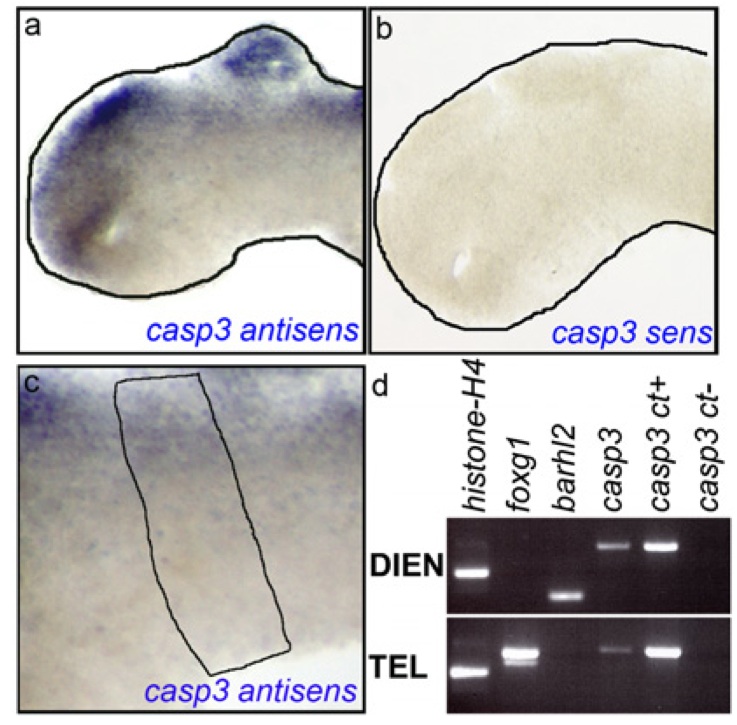 Fig. S1. casp3 and barhl2 are coexpressed in the stage (st) 26 prosomere P2. (AâC) ISH with casp3 antisens (A and C) or casp3 sens (B) probes on st 26 dissected neural tubes. (A and B) At st 26, casp3 is mostly expressed in the telencephalic prospective pallium, in the diencephalic and mesencephalic alar plates of the neural tube, and in the pineal gland. (C) Enlargement of the prosomere P2 area of A. barhl2 expression domain is indicated with a black line. (D) RT-PCR analysis on RNA purified from telencephalic (TEL) or diencephalic (DIEN) st 26 neural tube parts. Foxg1 and barhl2 are pallial TEL and DIEN markers, re- spectively. Histone H4 and the plasmid encoding Casp3 were used as positive controls, and water was a negative control (ct).