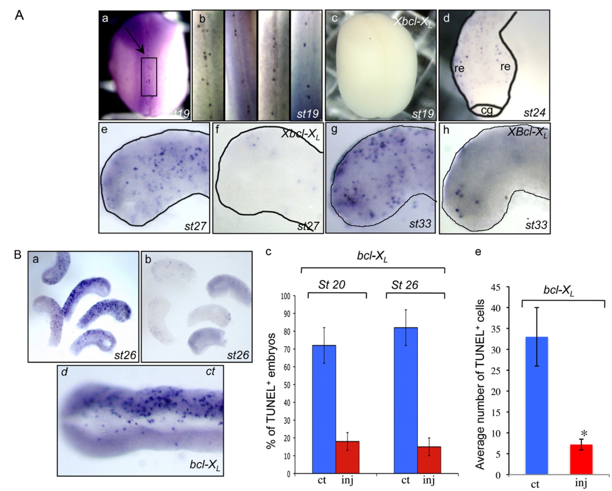 Fig. S2. From st 20 to 33, apoptotic nuclei are uniformly distributed in the anterior neural tube, and Bcl-XL overexpression protects anterior neural tube cells from apoptosis. (A) Apoptosis patterns. (a and b) TUNEL-positive cells occurred mainly along the dorsal closure line of the neural tube during neurulation (st 18â 20; 70%, n = 122). (d, e, and g) From st 20 to 33, cells died in the anterior part of the neural tube but were not confined to specific areas (n ⥠150 for each stage). (d ) WT representative embryos at st 24. Representative dissected neural tubes at (e) st 26â27 and (g) st 33. bcl-XL cRNA was injected into one dorsal blastomeres of four-cell embryos together with GFP as a tracer. TUNEL staining was performed on these embryos at (c) st 18â20, (f) 26 and 27, and (h) 33. (aâc) Dorsal view, anterior up; (b) an enlargement of WT st 19 embryos. (d) Anterior view, dorsal up. (eâh) Lateral view, anterior to the left. Re, retina; cg, cement gland.