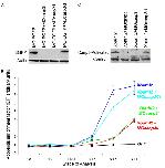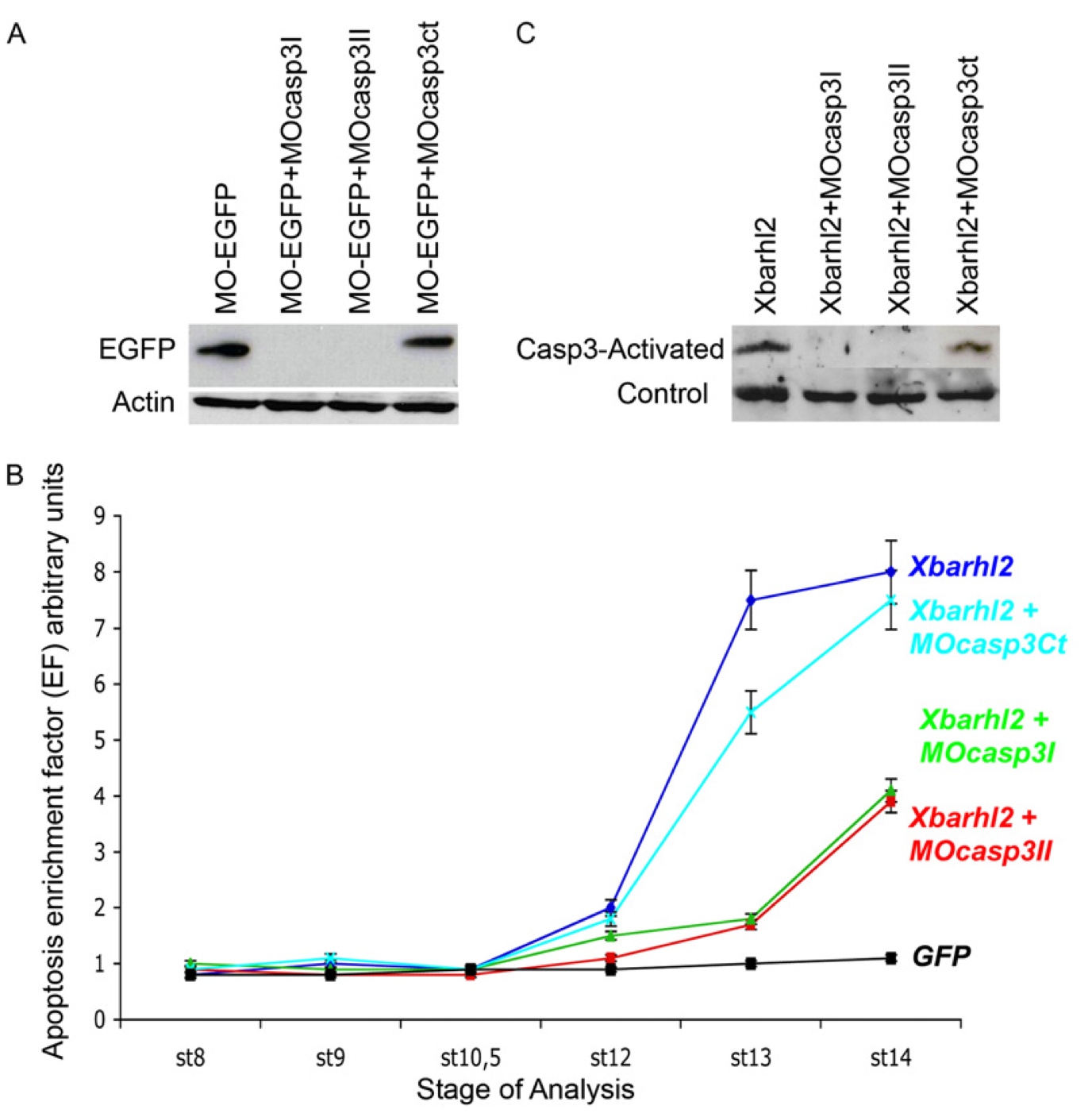 Fig. S3. MO against Casp3 protect Xenopus embryos from barhl2-induced apoptosis. Two MOs, MOcasp3I and MOcasp3II, were designed to inhibit endog- enous Casp3 activity together with a control MO, MOcasp3ct. We used three different means to evaluate the capacity of the Casp3 MO to specifically block endogenous Casp3 activity. (A) MOcasp3I and MOcasp3II bind their complementary sequences and inhibit translation in embryos. The 5â² end of the casp3 gene containing the MOcasp3I and MOcasp3II sequences was subcloned in-frame upstream of the EGFP cDNA. The 5â²-gtttggatcagatcgggttttggtagccaagATGgaa- gaatcccagaatggt-3â² sequence was subcloned in the ClaI site of the vector pCS2-EGFP to generate the MO-EGFP expression vector. Western blotting analysis showed that translation of this construct containing the 5â² end of the casp3 gene fused upstream of the EGFP gene was completely inhibited by coinjection with each specific MO, whereas coinjection with the control MO had no effect. (A) Western blot analysis against EGFP with 3-μg protein extracts from Xenopus st 13 embryos. Translation of the MO-EGFP fusion protein (lane 1) is inhibited by coinjection with MOcasp3I (lane 2) or MOcasp3II (lane 3), whereas MOcasp3ct has no effect (lane 4). α-actin (42 kDa) was used as a loading control. (B and C) MOcasp3I and MOcasp3II protect Xenopus embryos from apoptosis induced by Xbarhl2 overexpression. The protective effect of MOcasp3I and MOcasp3II against Barhl2-induced apoptosis was shown by ELISA to detect cytoplasmic histone- associated mono- and oligo-nucleosomes, which are specifically released during apoptosis (B) or by Western blotting (C). (B) Kinetics of Barhl2-induced ap- optosis between st 8 and st 14 in the presence or absence of MOcasp3. Embryos were injected in one dorsal blastomere at the two-cell stage with EGFP, barhl2 cRNA together with EGFP, barhl2 cRNA together with MOcasp3I, MOcasp3II, or MOcasp3ct and collected at the indicated developmental stages. Cell death was measured by an ELISA for cytoplasmic histone-associated mono- and oligo-nucleosomes that are specifically released during apoptosis. The apoptosis en- richment factor (EF) was calculated using GFP-injected embryos as a control. From st 10.5 on, a steady increase in the apoptosis EF can be observed in barhl2- injected embryos (EF = 8 at st 14). Coinjection of barhl2 cRNA with MOcasp3I or MOcasp3II induces a significant delay in the onset of apoptosis (EF = 4 at st 14), whereas embryos injected with barhl2 cRNA together with MOcasp3ct behave like embryos injected with barhl2 cRNA alone (EF = 7.8 at st 14). (C) Western blot analysis of 15 μg protein extracted from the same batches of embryos at st 13: lane 1, barhl2 (50 pg) and EGFP (50 pg); lane 2, barhl2 (50 pg) and MOcasp3I; lane 3, barhl2 (50 pg) and MOcasp3II; lane 4, barhl2 (50 pg) and MOcasp3ct. A nonspecific band was used as a loading control.