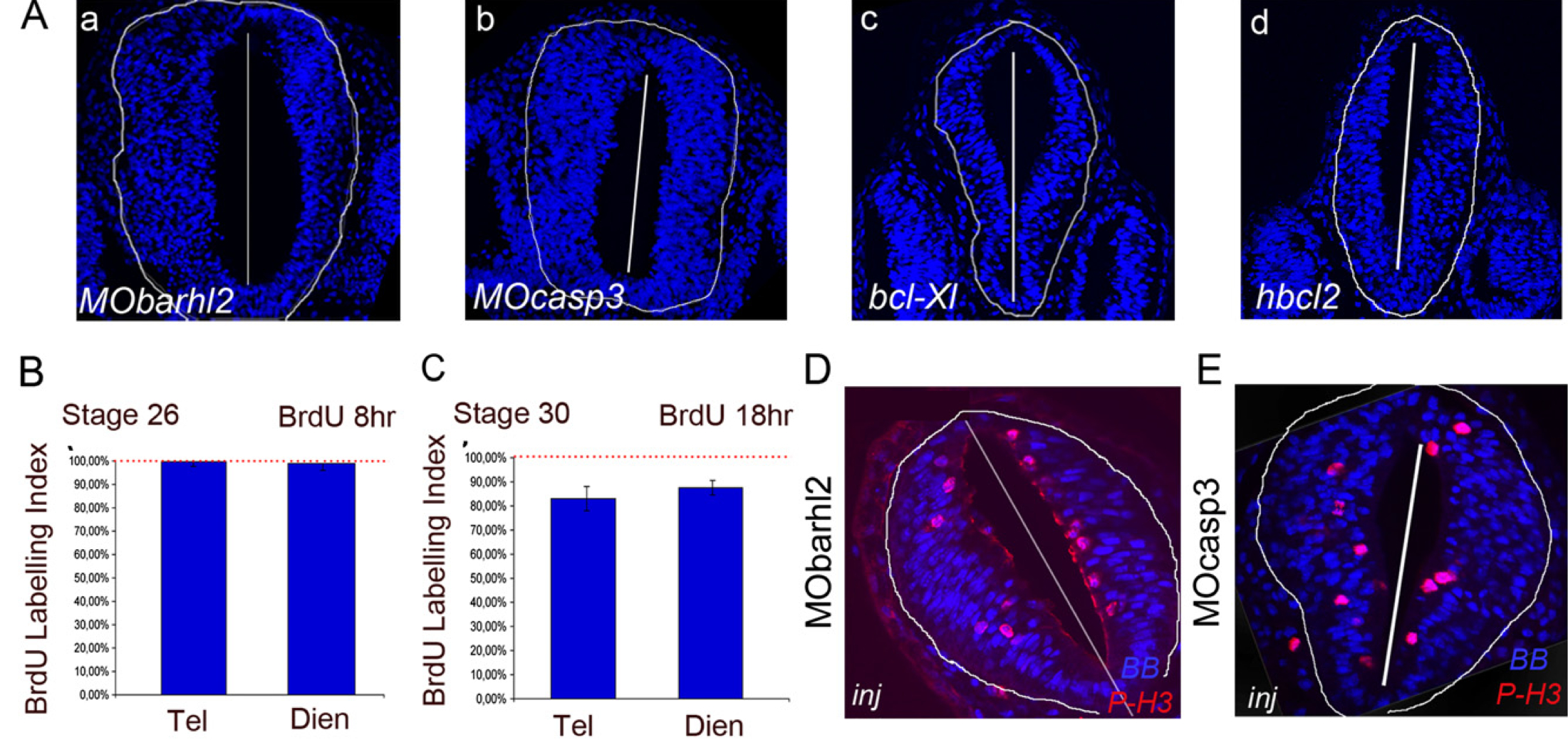 Fig. S4. Depletion of Barhl2 or Casp3 generates neural tube hyperplasia, an increase in the BrdU LI, and ectopic mitosis. (A) Depletion of Barhl2 or Casp3 generates neural tube hyperplasia. Xenopus embryos were injected with (a) MObarhl2-60 (60 ng), (b) MOcasp3-40 (40 ng), (c) bcl-XL cRNA, or (d) hbcl2 cRNA. Representative sections of st 26 embryos at the diencephalic level are shown dorsal side up. Cell nuclei are stained with BB. The white line indicates the midline of the neural tube and the limits of the neuroepithelium. The left side is the injected side. (B and C) Neuroepithelial cells all proliferate until st 26, and some neuroepithelial cells cease division after this point. The BrdU LI was measured after (B) 8 h starting at st 24 until st 26/27 or (C) 18 h starting at st 26/27 until st 30 of BrdU exposure in telencephalic and diencephalic sections. Each embryo was assessed independently. (B) Between st 24 and 27, 99.7% of telencephalic (n = 3) and 98.9% of diencephalic (n = 3) neural tube cells had incorporated BrdU and undergone at least one cell cycle. (C) Between st 26 and 30, only 84% of telencephalic (n = 3) and 88% of diencephalic (n = 3) neural tube cells had divided, arguing that some neuroepithelium cells had exited the cell cycle during this period. (D and E) Ectopic mitosis in Barhl2- and Casp3-depleted st 26 embryos. Representative sections of st 26 embryos at the diencephalic level, shown dorsal side up and immunostained for P-3H (red), merged with BB (blue) images.