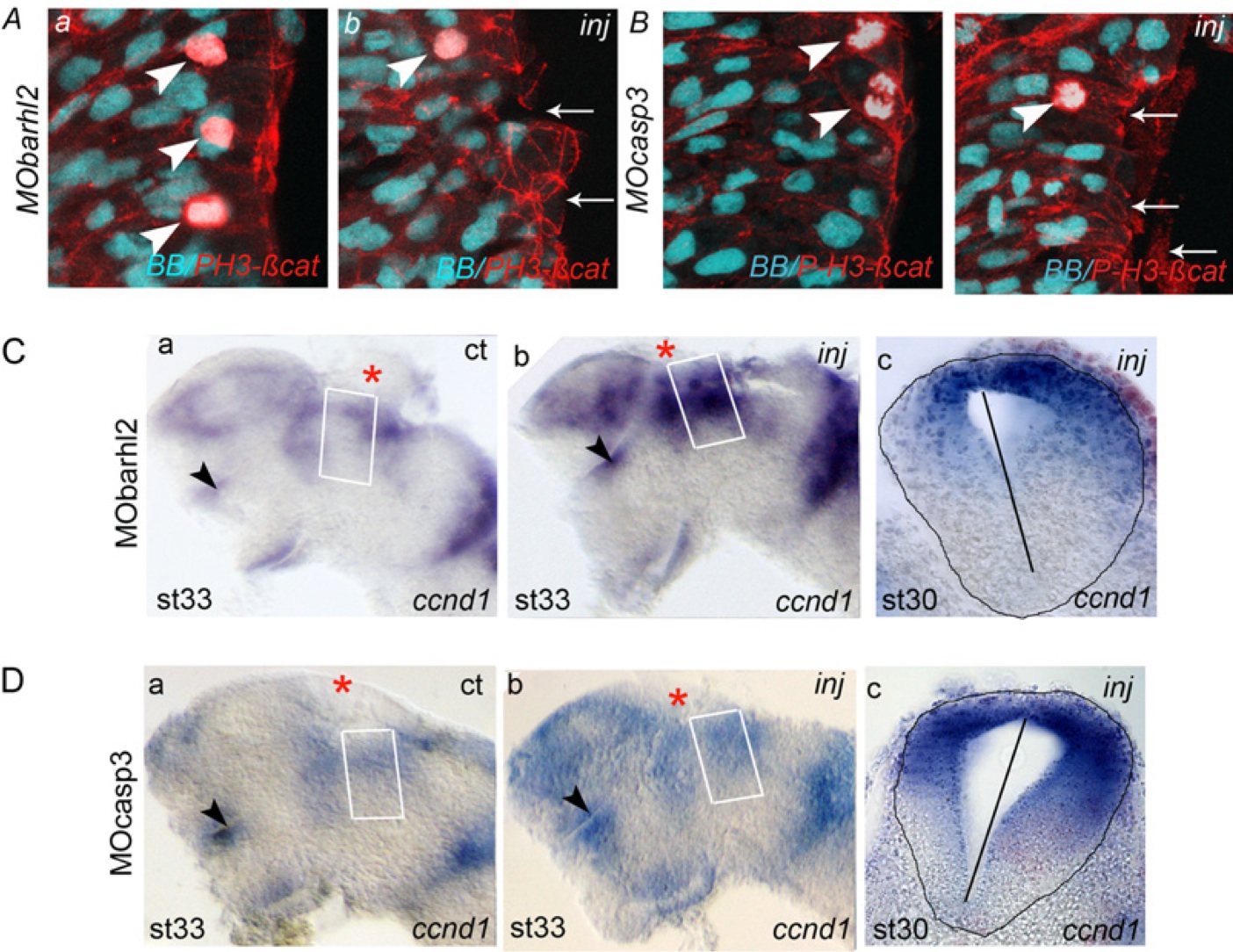 Fig. S5. Barhl2 or Casp3 depletion phenotypic defects. (A and B) Disorganization of the neuroepithelium. Representative IHC for β-catenin (red; membrane staining) together with P-3H (red; nuclear staining) merged with BB (cyan) images on diencephalic sections of st 26/27 Xenopus embryos injected with MO- barhl2 (A) or MOcasp3 (B). The (Aa) control and (Ab) injected sides of representative sections are shown. Inj, injected side. Arrows indicate part of the apical surface where β-catenin staining is abnormal; arrow end indicates mitotic nuclei. (C and D) Increase in Wnt signaling in the prosomere P2 alar plate ccnd1 expression profiles at st 33 or 30 analyzed by ISH. The ct (Ca) and injected (Cb) sides of one representative dissected neural tube flat-mounted and (Cc) a section at the diencephalic level are shown. The percent of embryos exhibiting the phenotype is indicated. (Ca) ct and (Cb and Cc) Barhl2-depleted (89%, n = 19); (Da) ct and (Db and Dc) Casp3-depleted neural tubes (82%, n = 39). The white rectangle delineates the prosomere P2 alar plate. The black arrow indicates lo- calization of the optic stalk.