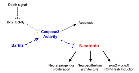 Fig. S7. A model for the genetic pathway for the regulation of β-catenin activity by Barhl2 and Casp3
