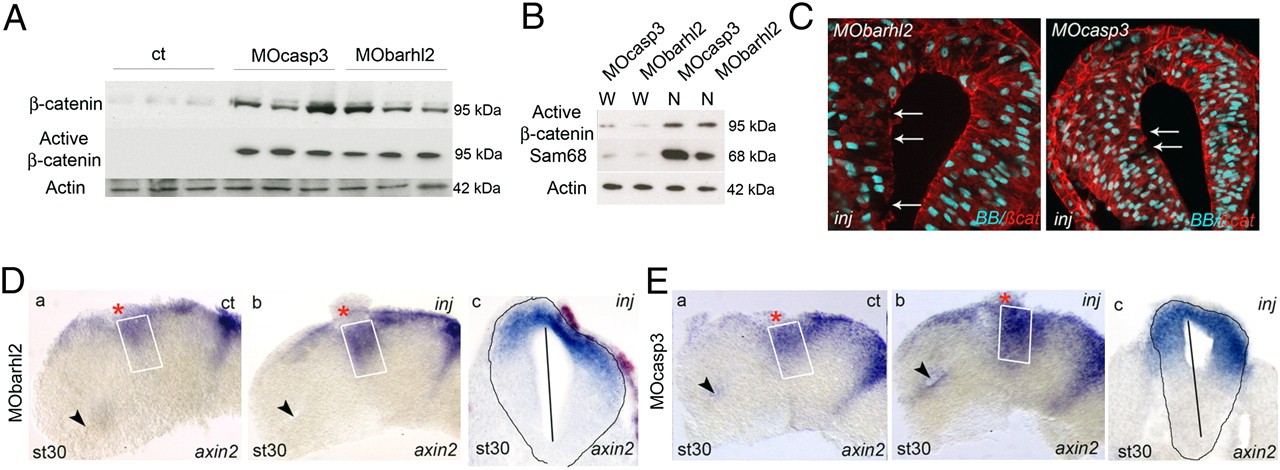 Fig. 2. Barhl2 and Casp3 depletion increases β-catenin and Wnt activity. (A and B) Western blot analysis. Proteins (10 μg) extracted from st 26 heads of embryos injected with GFP (ct), MOcasp3, or MObarhl2. α-actin (42 kDa) is used as a loading ct. (A) Barhl2- and Casp3-depleted head extracts exhibit a significant increase in both β-catenin and active β-catenin levels (95 kDa) as indicated. (B) Active β-catenin detected in MOcasp3- or MObarhl2-injected head extracts is enriched in nuclear head extracts (N) compared with that in whole-cell head extracts (W). Sam68 is used as a marker of proper nuclear proteins extraction. (C) β-catenin mislocalization. Representative IHC images for β-catenin (red) merged with BB (blue) on diencephalic sections of st 26/27 embryos injected with MObarhl2 or MOcasp3. Arrows indicate the part of apical surfaces where β-catenin staining is disrupted. Inj, injected side. (D and E) Analysis of Wnt activity. axin2 expression profiles at st 30 analyzed by ISH. The ct (a) and injected (b) sides of one representative dissected neural tube flat-mounted or (c) a section at the diencephalic level are shown. The percent of embryos exhibiting the phenotype is indicated. (Da) ct and (Db and Dc) Barhl2-depleted (80%, n = 15) and (Ea) ct and (Eb and Ec) Casp3-depleted neural tubes (78%, n = 18). The white rectangle delineates the prosomere P2 alar plate. The black arrow indicates localization of the optic stalk.
