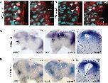 Fig. 1. Barhl2 or Casp3 depletion influence on neural tube hyperplasia, cell-cycle length, and neuroepithelium architecture. (A) barhl2 is expressed in the prosomere P2. ISH or double ISH on dissected neural tubes. (a) At st 26, barhl2 is expressed at the epichordalâprechordal border in the alar and basal plates of the neural tube. (b) At st 31 and 32, barhl2 expression overlaps with that of wnt3A (compare b and c). (c) The barhl2 rostral border of expression coincides with the rostral border of the ZLI (black arrow). (d) At st 33, barhl2 is expressed in the prospective diencephalon in the prospective pallium (1), the medial part of the pretectum (2), and the dorsal mesencephalon and future cerebellum (3). The pineal gland is indicated with a red star. (B) casp3 is expressed in the neural plate (st 15) and neural tube (st 26). RT-PCR analysis. chordin and Ncam are mesodermal and neuroectodermal markers, respectively. XEF-1α and the plasmid encoding Casp3 were used as positive controls, and water was the negative ct. (C) Average ratio of the number of nuclei on the MO/RNA-injected side of the neural tube relative to that on the ct side. Embryos were injected with MObarhl2, MOcasp3, bcl-XL, or hbcl2 cRNA. The dotted line indicates a ratio of 1. MObarhl2ct (n = 3); MObarhl2-40 (40 ng; n = 6); MObarhl3-60 (60 ng; n = 7); MOcasp3ct (n = 3); MOcasp3-20 (20 ng; n = 5); MOcasp3-40 (40 ng; n = 8); bcl-XL (n = 5); hbcl2 (n = 4). The differences in Rinj/ct between MObarhl2ct and MObarhl2-60 (P ⤠0.033), MObarhl2ct and MObarhl2-40 (P ⤠0.06), and MOcasp3ct and MOcasp-40 (P ⤠0.036) are significant. (DâG) BrdU labeling index (LI). (D and E) Representative st 26 diencephalic sections immunostained for BrdU (green) merged with bisbenzimide (BB; blue). BrdU LI was measured in st 26 forebrain neuroepithelium in (F) Barhl2- and (G) Casp3-depleted sections. (F) MObarhl2-injected embryos: telencephalon (ct vs. inj; n = 5, P ⤠0.41) and diencephalon (ct vs. inj; n = 9, P ⤠0.0001). (G) MOcasp3-injected embryos: telencephalon (ct vs. inj; n = 5, P ⤠0.141) and diencephalon (ct vs. inj; n = 9, P ⤠0.0001). ct, ct side; inj, injected side. (H and I) BrdU cumulative analysis. In st 26 diencephalic neuroepithelium, the cumulative BrdU incorporation rate measured as the slope of the linear regression function is higher in the injected side (red) vs. the ct side (blue) of (H) MObarhl2-injected (0.130 vs. 0.094; n ⥠4 for each time point) or (I) MOcasp3-injected (0.1344 vs. 0.098; n ⥠4 for each time point) embryos. H, hours. The average cell-cycle length, as described by Tc value, decreases in both MObarhl2- (Tc = 6.9 ± 0.64 h) and MOcasp3-injected (Tc = 7.1 ± 0.64 h) cells compared with noninjected cells (Tc = 8.7 ± 0.65 h and Tc = 8.9 ± 0.65 h), respectively. The changes in Tc observed among different types of cells are not affected by Ts, the duration of the S phase, which is always evaluated at 1.54 ± 0.28 h. (J) Mitotic index. MObarhl2 (ct vs. inj; n = 8, P ⤠0.008) and MOcasp3 (ct vs. inj; n = 8, P ⤠0.001). (K) Ratio of ectopic mitotic figures. Ratio of P-3Hâpositive cells outside the ependymal zone (at least two cellular diameters) relative to the total number of mitotic cells. MObarhl2 (n = 8, P ⤠0.0001) and MOcasp3 (n = 7, P ⤠0.0001).
