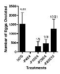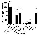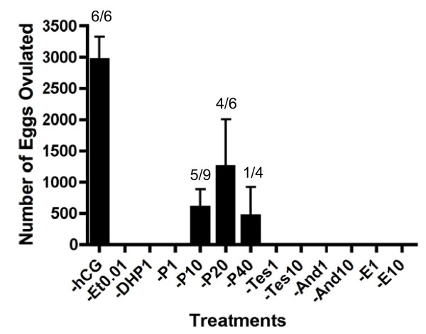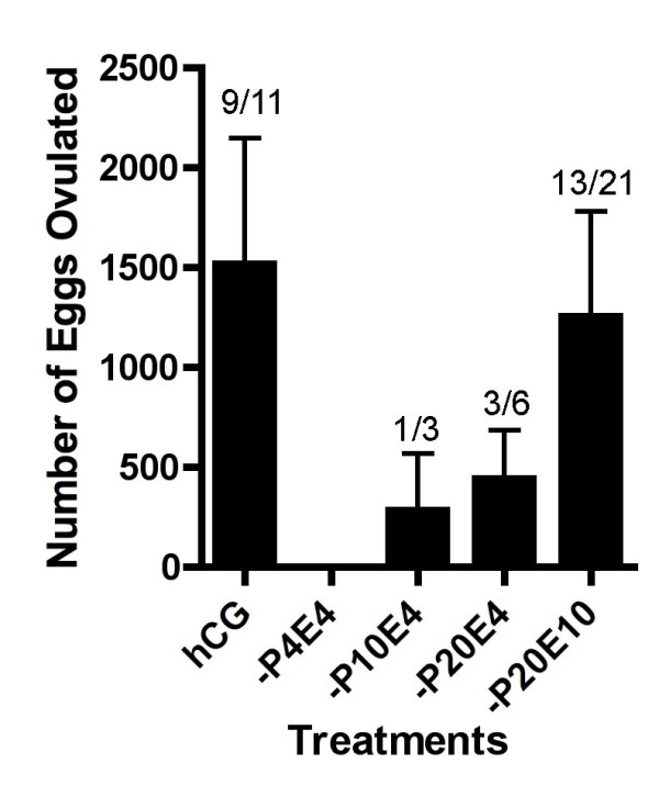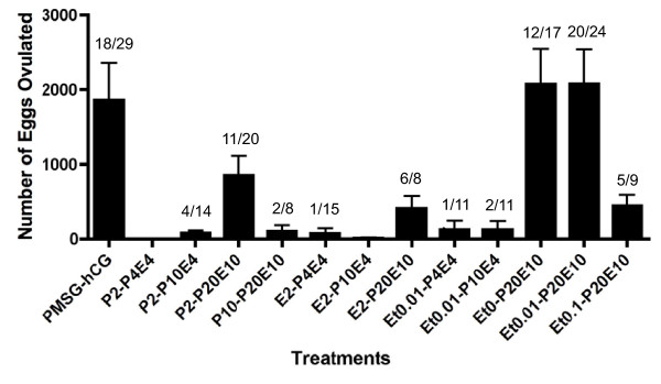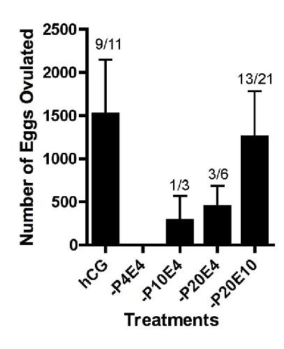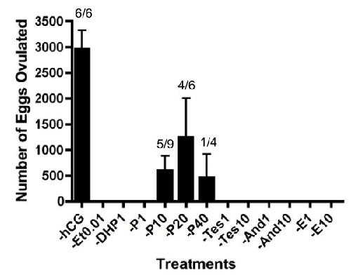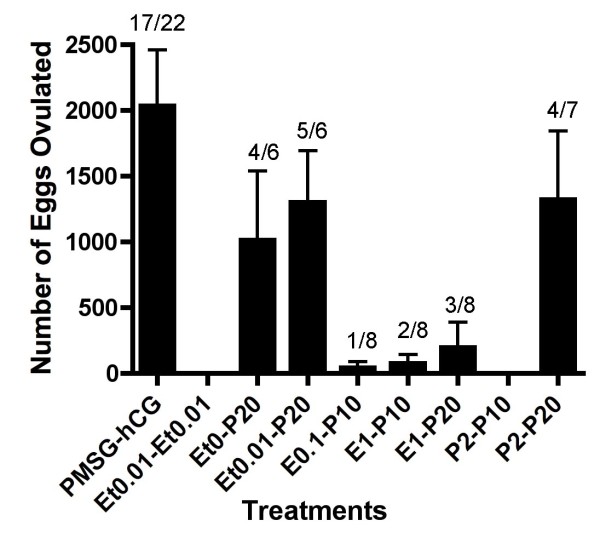 Figure 4. Synergistic effects of pre-treatment and a cocktail of steroids upon induction of ovulation. Frogs were pre-treated with or without (Ethanol alone) steroids, or at the indicated concentrations, for one day before ovulation induction by a mixture of steroids. Frogs were then treated with a mixture of estradiol and progesterone at the indicated concentrations. After 24 to 30 hr incubation, the numbers of ovulated eggs were counted as described in the Materials and Methods. Annotations underneath each column indicate substance and concentration for both pre-treatment and the induction of ovulation. For example, Et0-P20E10 represents pre-treatment with 0% ethanol for one day followed by induction by a mixture of 20 μM progesterone and 10 μM estradiol the following day. The left column represents the induction results in response to PMSG-hCG injection. Each value represents the mean of data from more than three different females. The number of ovulated frogs per number treated is indicated over each column. Vertical lines indicate standard deviation.