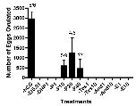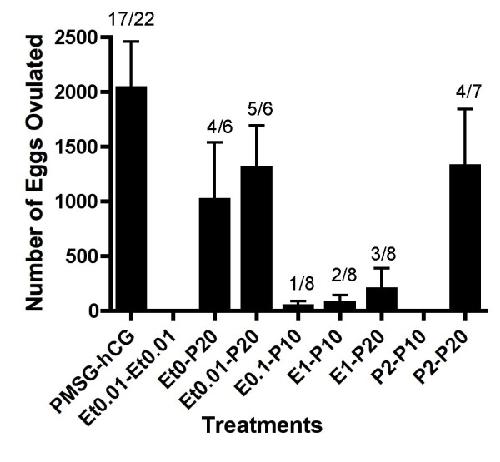Figure 2. The effect of steroid pre-treatment upon progesterone-induced ovulation. Frogs were pre-treated with ethanol (Et), estradiol (E) or progesterone (P) at the indicated concentration for a period of one day before induction by progesterone. The left column represents induction results in response to PMSG-hCG injection. After 24 to 30 hr incubation, the number of ovulated eggs was counted as described in the Materials and Methods. Annotations underneath each column indicate substance and concentration for both pre-treatment and the induction of ovulation. For example, Et0-P20 represents pre-treatment with 0% ethanol for one day followed by induction by a mixture of 20 μM progesterone the following day. Each value represents the mean of data from more than three different females. The number of ovulated frogs per number treated is indicated over each column. Vertical lines indicate standard deviation.