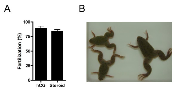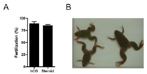 Figure 5. Externally applied steroids induced natural spawning. (A) Artificial insemination was conducted for eggs squeezed during spawning induced by a mixture of steroids (Steroid). As a control, the fertilization rate of eggs ovulated by PMSG-hCG injection was examined (hCG). Fertilisation rate (in %) was assessed by counting the number of eggs dividing to the 4 cell stage following insemination. Each value represents the mean of data from three different females. Vertical lines indicate standard deviation. (B) A photograph of frogs developed from eggs ovulated by steroids.