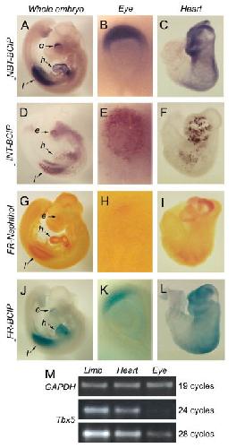 Figure 1. The high sensitivity of color development reaction with FR-BCIP comparable with NBT-BCIP. Whole-mount ISH for Tbx5 mRNA in E3 chick embryos using different color substrates, NBT-BCIP (A), INT-BCIP (D), FR-Naphthol (G), and FR-BCIP (J). High magnification of the eye (B,E,H,K) and the heart (C,F,I,L). reverse transcriptase-polymerase chain reaction (PCR) analysis of Tbx-5 and GAPDH mRNA (M). The number of PCR cycles used is indicated. e, eye; h, heart; l, limb; FR, Fast Red 1-5-naphethediol; BCIP, 5-bromo-4-chloro-3indolyl-phosphate; NBT, nitroblue-tetrazolium chloride; ISH, in situ hybridization; INT, 2-(4-iodopenyl)-3-(4-nitropenyl)-5-phenyltetrazolium chloride.