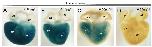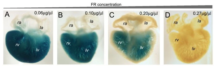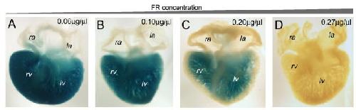 Figure 2. Higher FR concentrations diminish FR-BCIP color development. A: ISH for VMHC1 (Bisaha and Bader,1991) on embryonic day (E) 6 chick hearts varying concentration of FR at 0.06 μg/μl (A), 0.10 μg/μl (B), 0.20 μg/μl (C), and 0.27 μg/μl (D) with the constant concentration of BCIP. A,B: Note that, at lower concentrations of FR, color development was detected throughout the ventricular myocardium visualizing the known VMHC1 expression pattern in the embryonic heart at this stage. C,D: Higher concentration of FR resulted in diminished color reaction (C) associated with a high yellowish background (D). ra, right atrium; la, left atrium; rv, right ventricle; lv, left ventricle; FR, Fast Red 1-5-naphethediol; BCIP, 5-bromo-4-chloro-3indolyl-phosphate; ISH, in situ hybridization; VMHC1, ventricular myosin heavy chain-1.