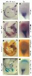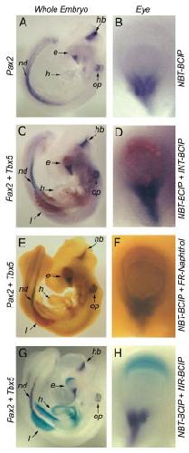 Figure 3. FR-BCIP color precipitate is distinct from that of NBT-BCIP in whole-mount DISH. A,B: Single ISH for Pax2 mRNA with NBT-BCIP. C: DISH for Pax2 mRNA with NBT-BCIP and for Tbx5 mRNA with either INT-BCIP (C,D), FR-Naphthol (E,F), or FR-BCIP (G,H). High magnification of the eye (B,D,F,H). e, eye; h, heart; hb, hind brain; l, limb; nd, nephric duct; op, otic placode. FR, Fast Red 1-5-naphethediol; BCIP, 5-bromo-4-chloro-3indolyl-phosphate; DISH, double in situ hybridization; ISH, in situ hybridization; INT, 2-(4-iodopenyl)-3-(4-nitropenyl)-5-phenyltetrazolium chloride.