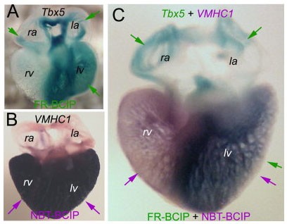 Figure 4. DISH with NBT-BCIP and FR-BCIP for Tbx5 and VMHC1 showing identifiable zones of overlapping expression. A: Single ISH for Tbx5 mRNA using FR-BCIP. Note expression (turquoise arrows) in the right atrium (ra), the left atrium (la) and the left ventricle (lv), but no detectable expression in the right ventricle (rv). B: Single ISH for VMHC1 mRNA using NBT-BCIP, showing expression in the left and right ventricles (purple arrows) but no detectable expression in the atria. C: DISH for Tbx5 and VMHC1 mRNAs. Note that overlapped expression of the two genes is evident in the left ventricle (turquoise and purple arrows), whereas no significant coexpression is detectable in the atria or right ventricle. DISH, double in situ hybridization; NBT, nitroblue-tetrazolium chloride; BCIP, 5-bromo-4-chloro-3indolyl-phosphate; FR, Fast Red 1-5-naphethediol; VMHC1, ventricular myosin heavy chain-1;