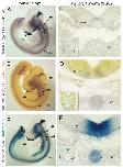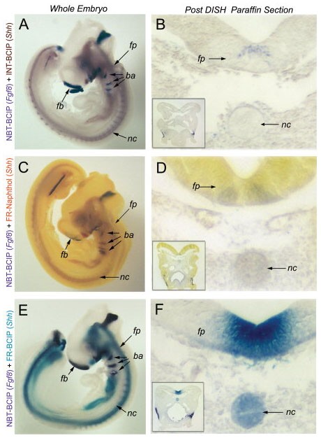 Figure 5. Stability of FR-BCIP precipitates through post-DISH paraffin sectioning. A: DISH for Fgf8 with NBT-BCIP and Shh with either INT-BCIP (A,B), FR-Naphthol (C,D), and FR-BCIP (E,F). After whole-mount DISH (A,C,E), embryos were processed for paraffin sectioning. High-magnification view (B,D,F) of areas containing notochord and floor plate from post-DISH paraffin sections (inset). ba, branchial arches; fb, forebrain; fp, floor plate; nc, notochord; FR, Fast Red 1-5-naphethediol; BCIP, 5-bromo-4-chloro-3indolyl-phosphate; DISH, double in situ hybridization; NBT, nitroblue-tetrazolium chloride; INT, 2-(4-iodopenyl)-3-(4-nitropenyl)-5-phenyltetrazolium chloride.