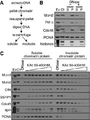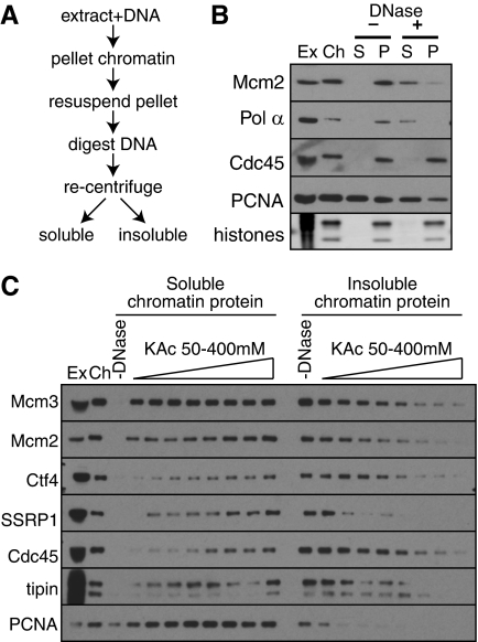 FIGURE 1. Protein release from replicating X. laevis chromatin. A, schematic representation of chromatin protein preparation procedure. B and C, chromatin was isolated from egg extract in the middle of S-phase (when replisome proteins peak on chromatin) in the presence of 50 mm potassium acetate, and DNA was digested by Benzonase and sonication. Ex, 0.5 μl of egg extract; Ch, chromatin after first centrifugation; other lanes correspond to material isolated from 5 μl of egg extract. B, chromatin was maintained in 50 mm potassium acetate throughout the procedure. P, pellet after DNA digestion; S, supernatant after DNA digestion. C, after DNA digestion, the salt concentration was adjusted to the 50, 100, 150, 200, 250, 300, 350, or 400 mm potassium acetate before samples were separated by centrifugation into soluble and insoluble (pellet) fractions. Fractions were separated by SDS-PAGE and immunoblotted with antibodies to the indicated proteins.