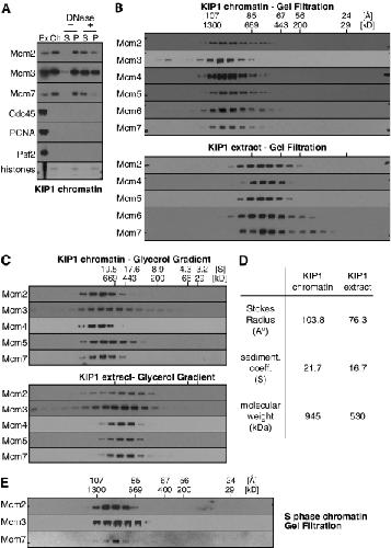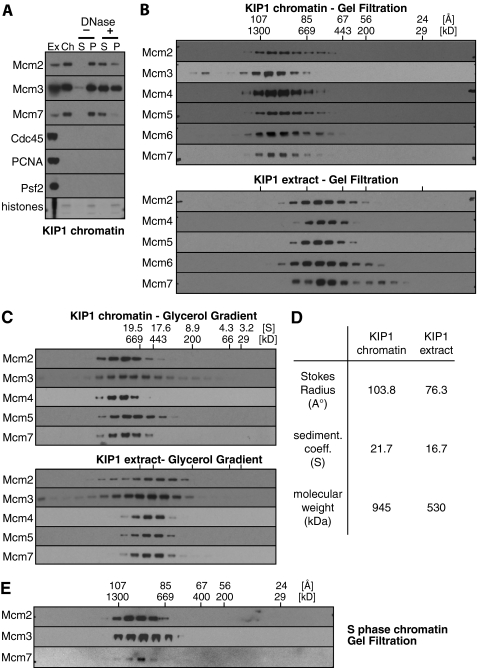 FIGURE 2. Mcm2-7 form large complexes on chromatin before replication initiation. Chromatin was isolated from egg extract plus or minus 100 nm p27KIP1 and chromatin proteins released in 50 mm potassium acetate. A, Ex, 0.5 μl egg extract; Ch, chromatin after first centrifugation; other lanes correspond to insoluble pellet (P), and soluble chromatin (S) from 5 μl extract. B and C, top panels: chromatin was isolated from extracts treated with p27KIP1 and soluble proteins released in 50 mm potassium acetate were subjected to gel filtration (B) or glycerol gradient fractionation (C) and immunoblotted with antibodies to Mcm2-7. Bottom panels: extract incubated with 100 nm p27KIP1 was subjected to gel filtration (B) or glycerol gradient fractionation (C) in buffer containing 50 mm potassium acetate and immunoblotted with antibodies to Mcm2-7. D, data from B and C were used to determine the molecular weight of Mcm2-7 complexes in whole extract and in chromatin. E, chromatin in mid S phase was isolated from extracts without added p27KIP1 and soluble proteins separated by gel filtration as for B.