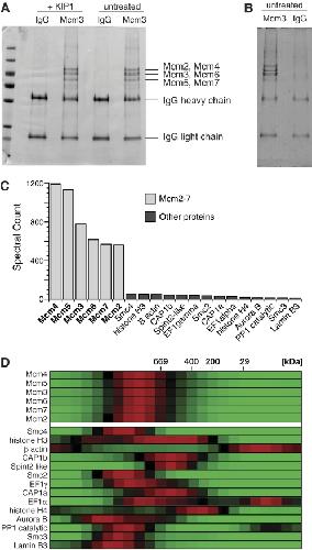 FIGURE 3. Mcm2-7 complexes immunoprecipitated from chromatin assembled in egg extract with blocked CDK activity look the same as Mcm2-7 at unfired origins in S-phase. Chromatin was isolated from egg extract plus or minus 100 nm p27KIP1 and chromatin proteins were released in 50 mm potassium acetate. Soluble protein was then separated by gel filtration. A and B, high molecular weight fractions containing Mcm2-7 were pooled and immunoprecipitated with either non-immune or anti-Mcm3 antibodies. Immunoprecipitates were separated by SDS-PAGE and gels were stained with colloidal Coomassie stain. C, gel shown in B was sliced into 40 segments, and each segment was subjected to mass spectrometry. The spectral count for each identified protein was summed over all 40 gel slices. The top 20 identified proteins specific for the Mcm3 immunoprecipitate are shown, along with its spectral count. D, each of the gel filtration fractions were analyzed by mass spectrometry, and the abundance of proteins estimated by total ion current. For the 20 proteins shown in C, the relative protein abundance across the gel filtration column is shown as a heat map. Red, peak abundance; black, half-peak abundance; green, no protein detected.
